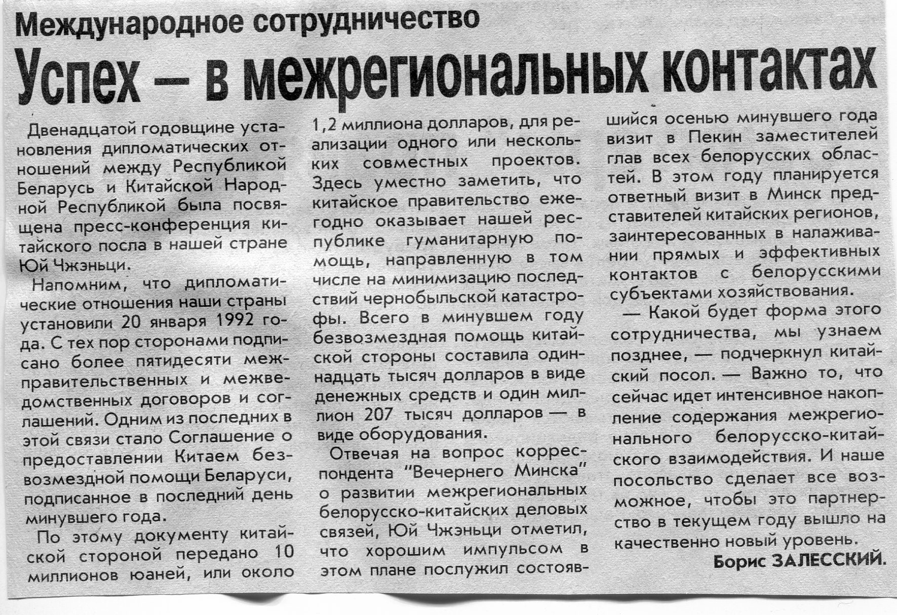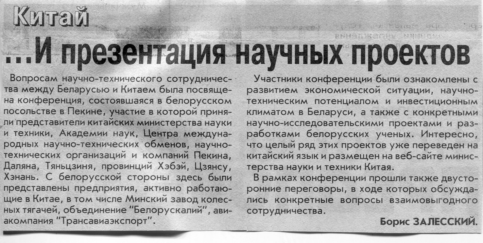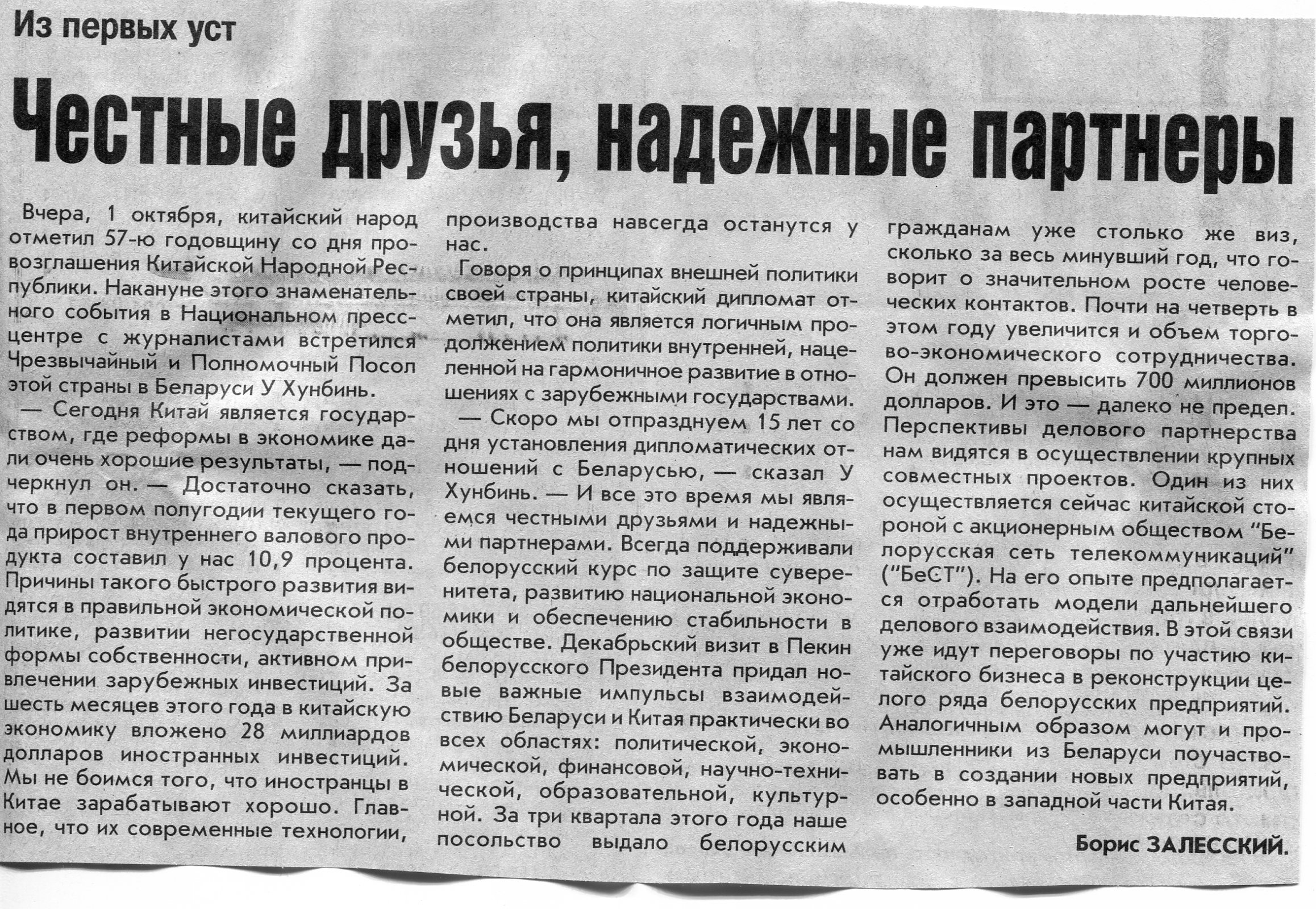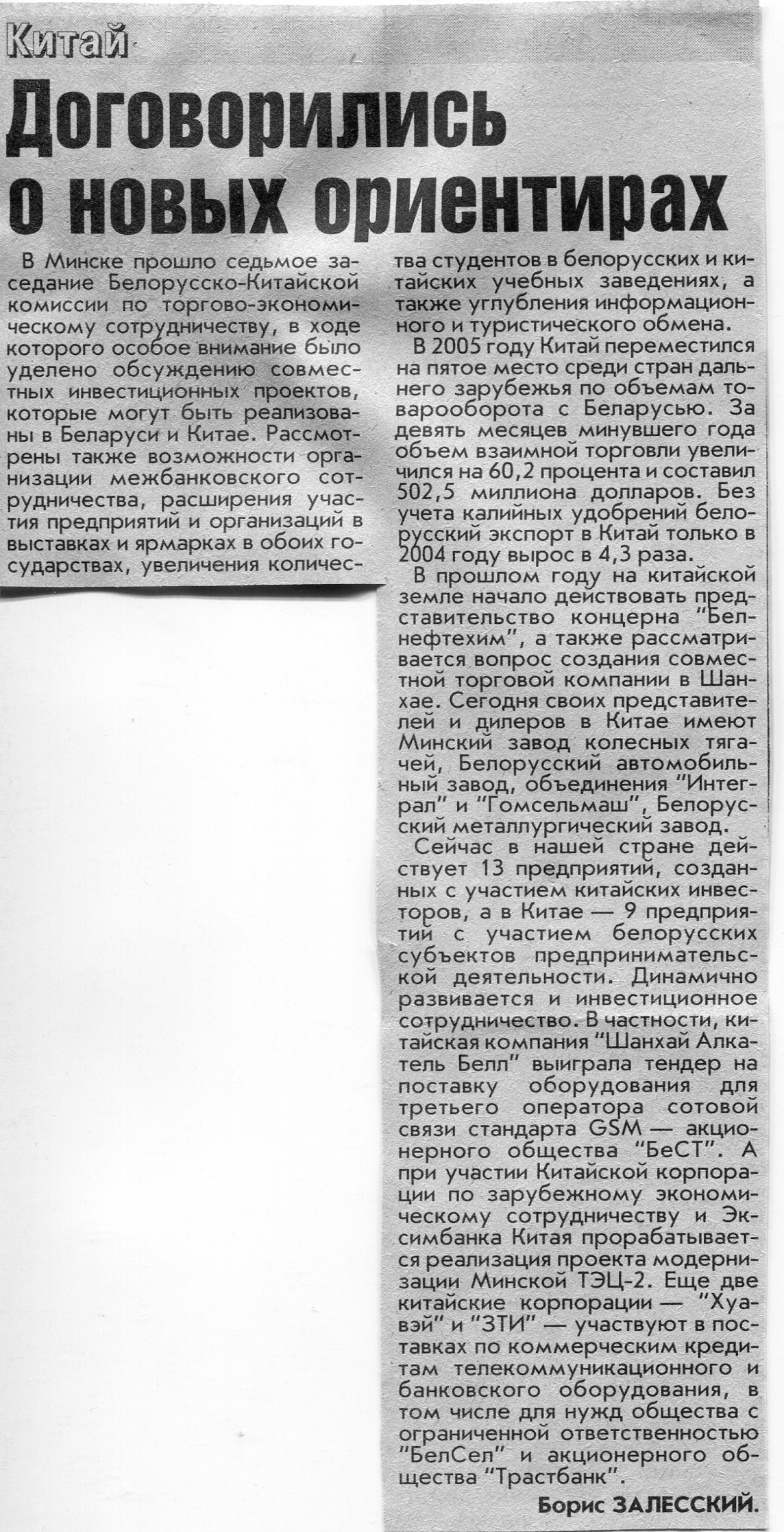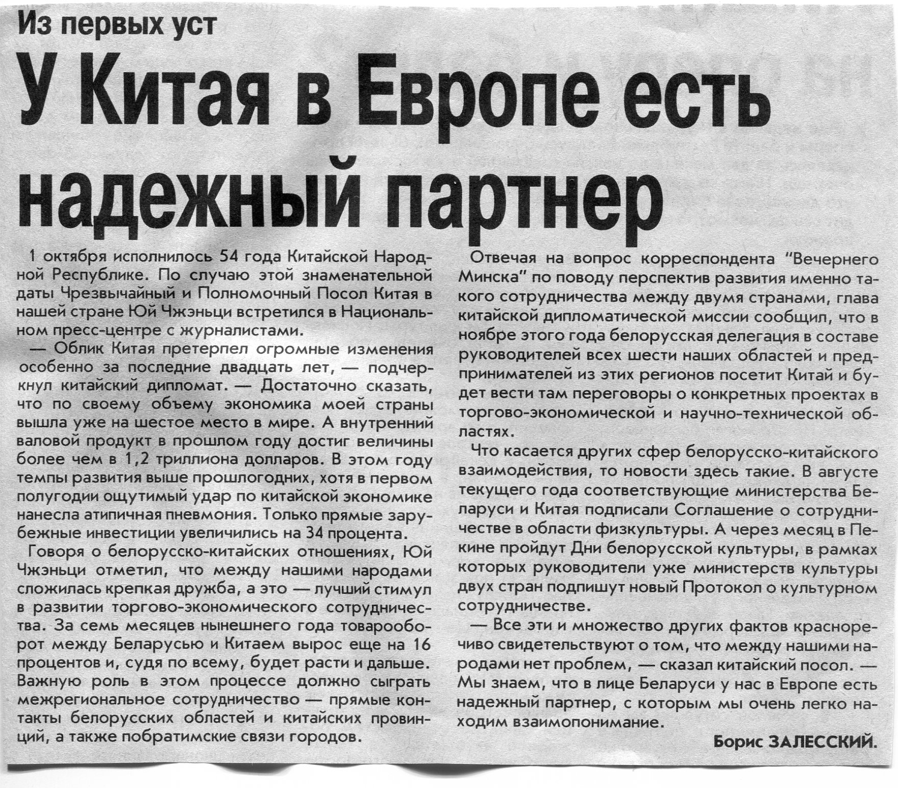 Залесский, Б. У Китая в Европе есть надежный партнер / Б. Залесский // Вечерний Минск. - 2003. - 2 окт.