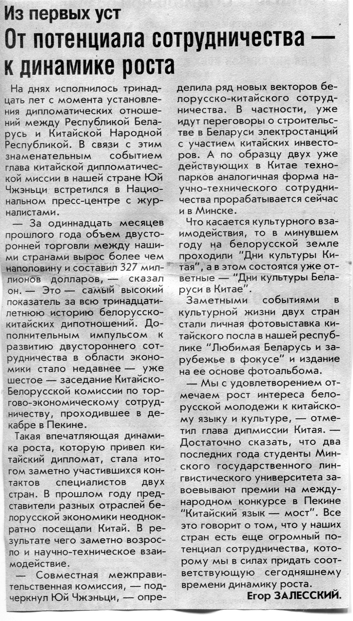 Залесский, Е. От потенциала сотрудничества - к динамике роста / Е. Залесский // Вечерний Минск. - 2005. - 27 янв.
