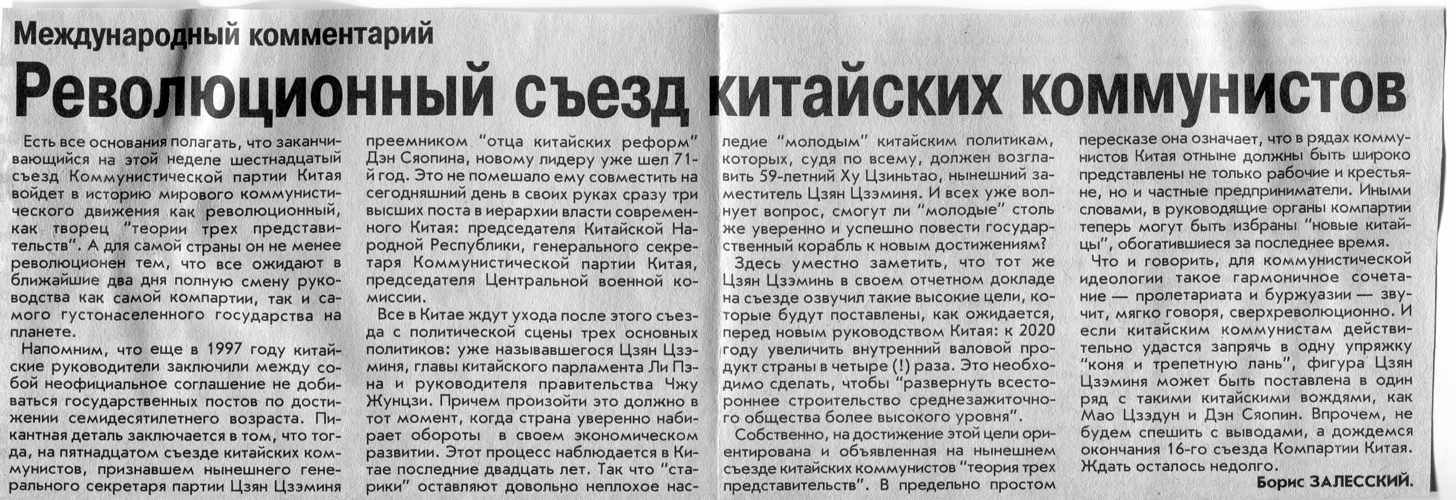 Залесский, Б. Революционный съезд китайских коммунистов / Б. Залесский // Вечерний Минск. - 2002. - 13 нояб.