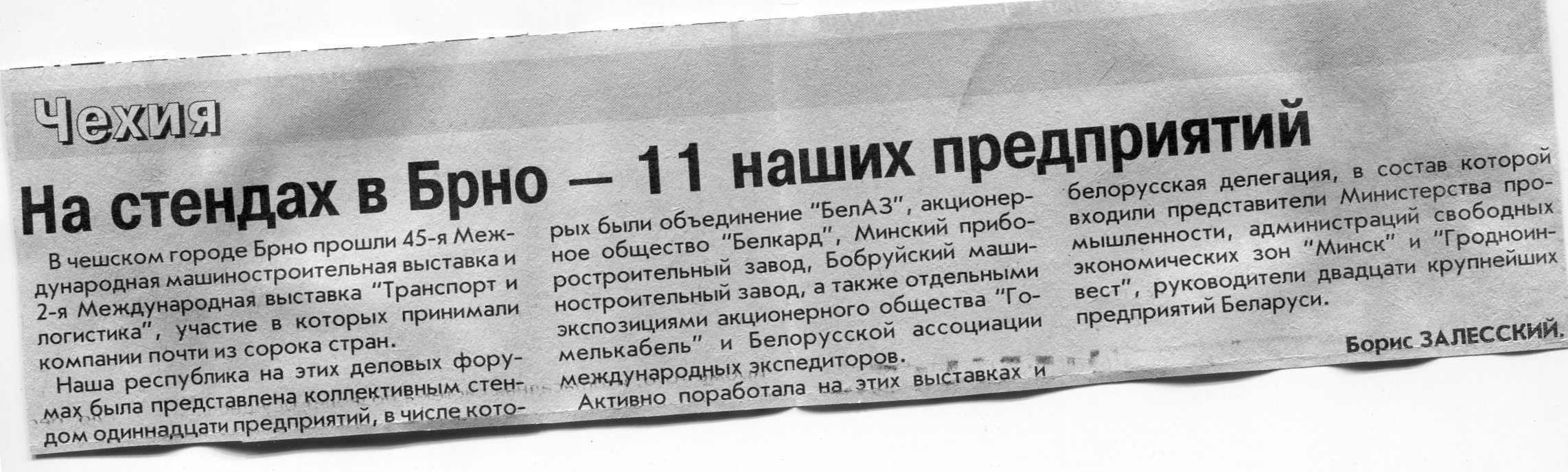 Залесский, Б. На стендах в Брно - 11 наших предприятий / Б. Залесский // Вечерний Минск. - 2003. - 25 сент.