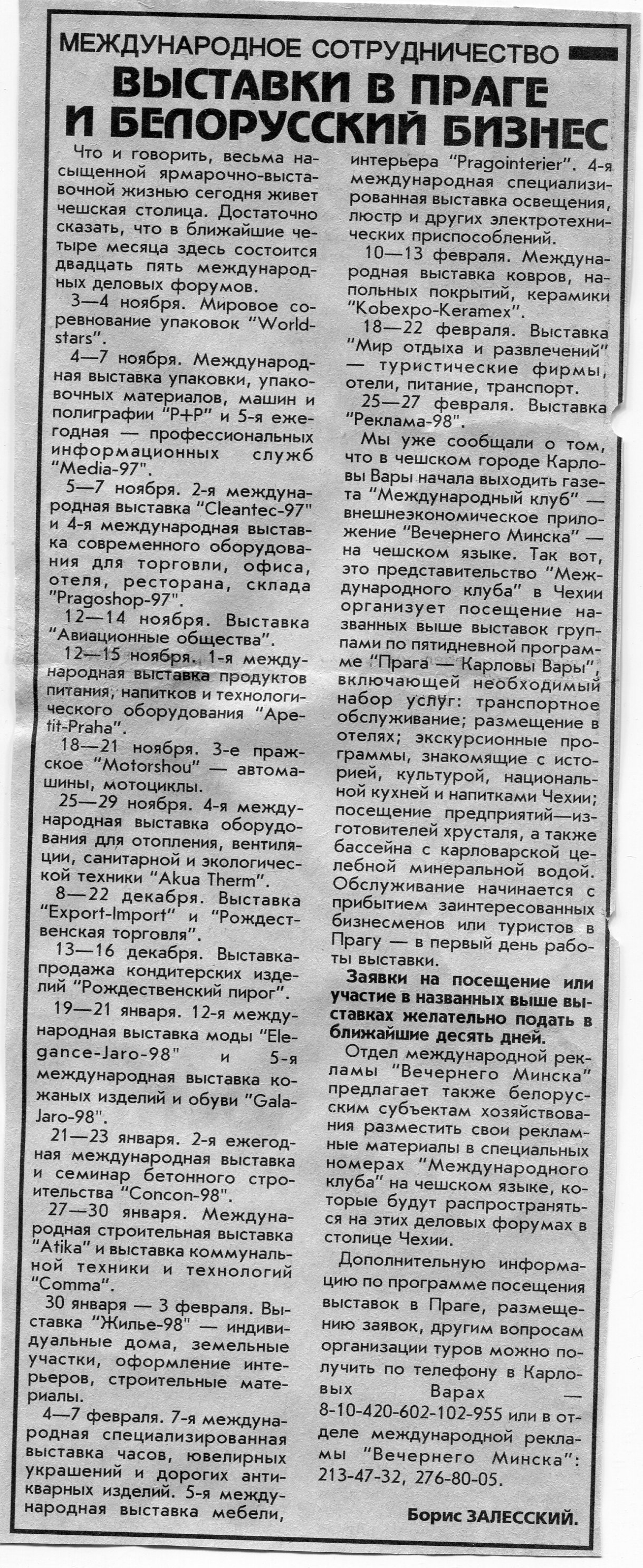 Залесский, Б. Выставки в Праге и белорусский бизнес / Б. Залесский // Вечерний Минск. - 1997. - 3 нояб.