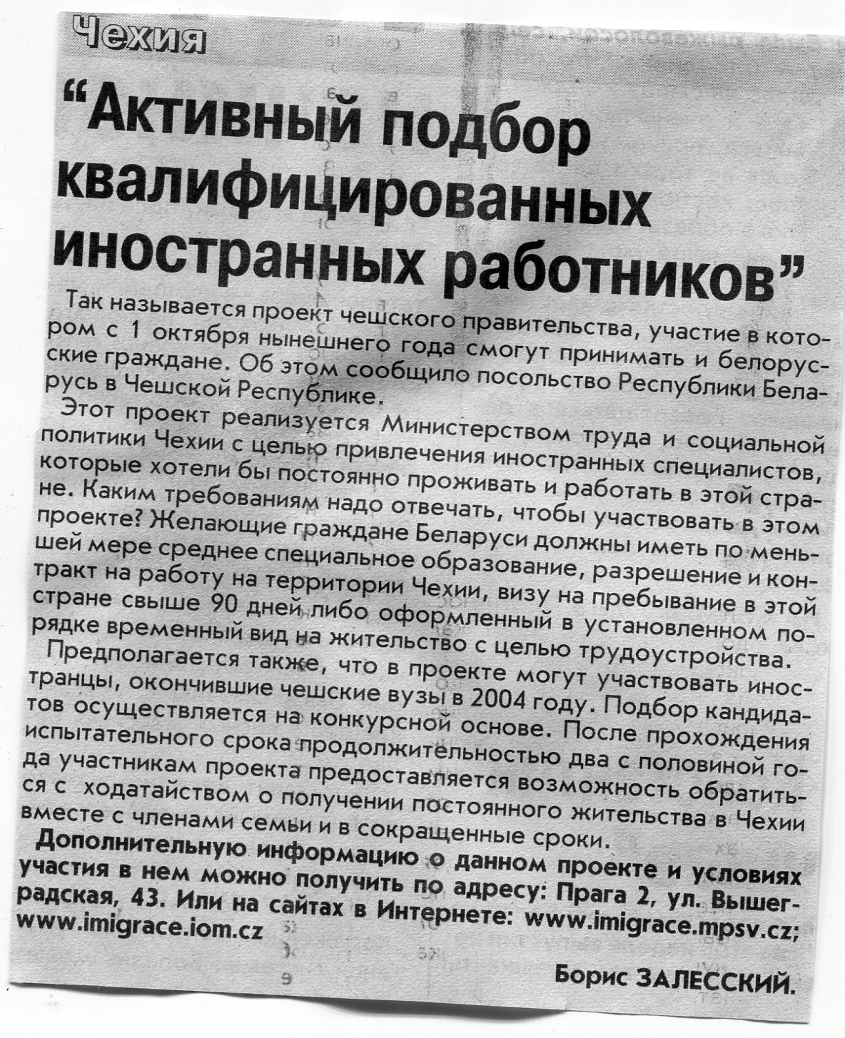 Залесский, Б. "Активный подбор квалифицированных иностранных работников" / Б. Залесский // Вечерний Минск. - 2004. - 26 июл.