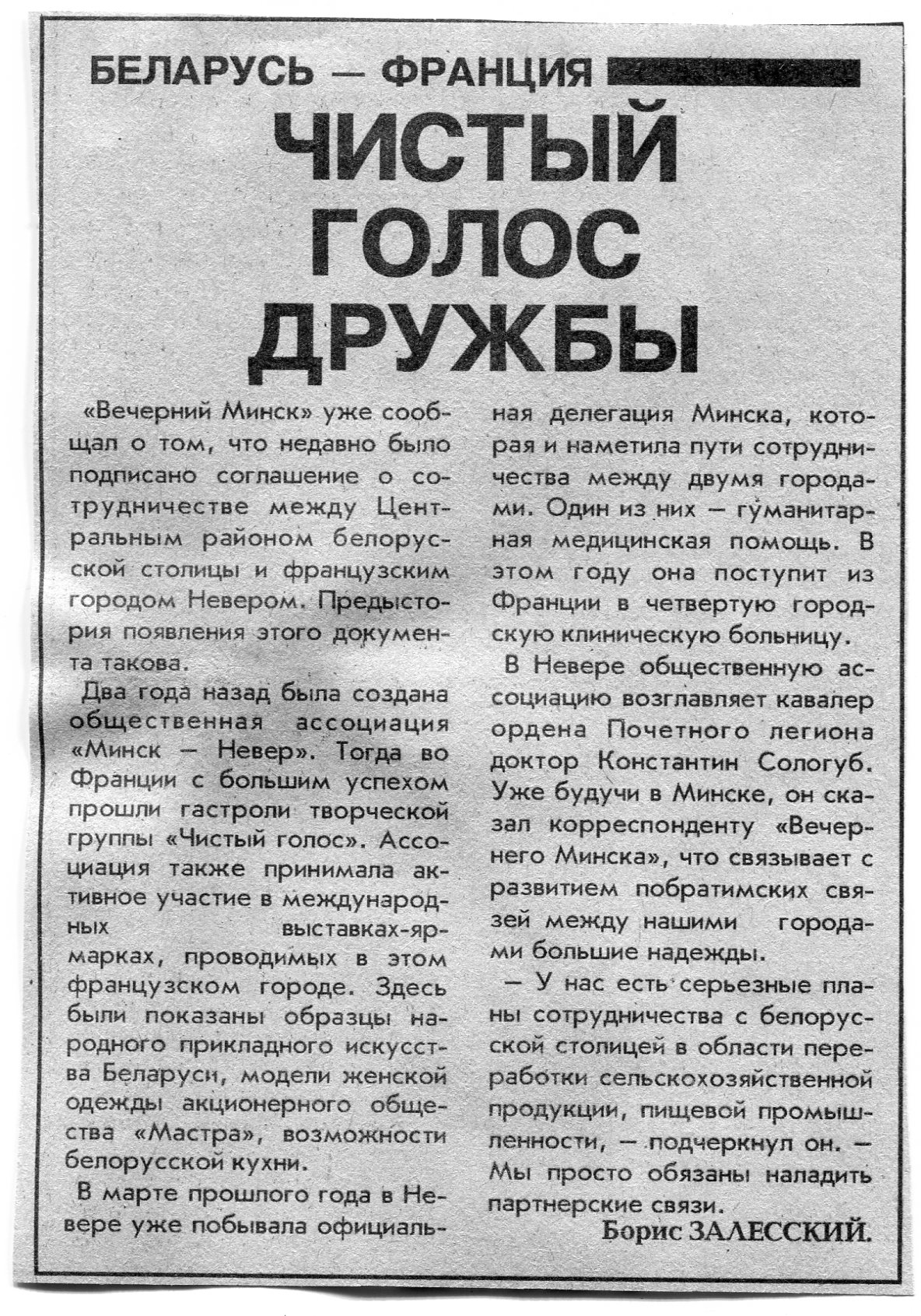 Залесский, Б. Чистый голос дружбы / Б. Залесский // Вечерний Минск. - 1995. - 3 окт.