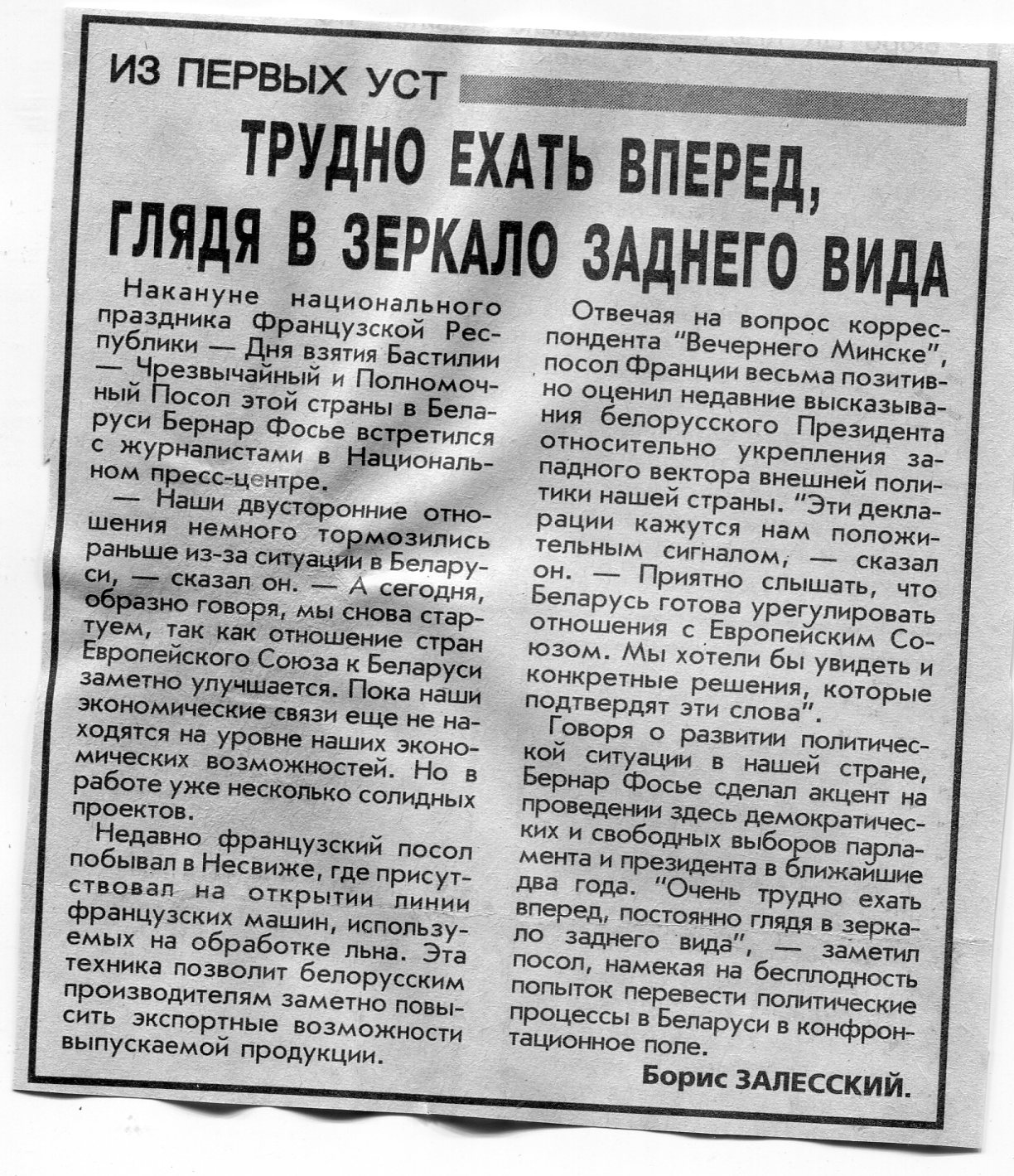 Залесский, Б. Трудно ехать вперед, глядя в зеркало заднего вида / Б. Залесский // Вечерний Минск. - 1999. - 15 июл.