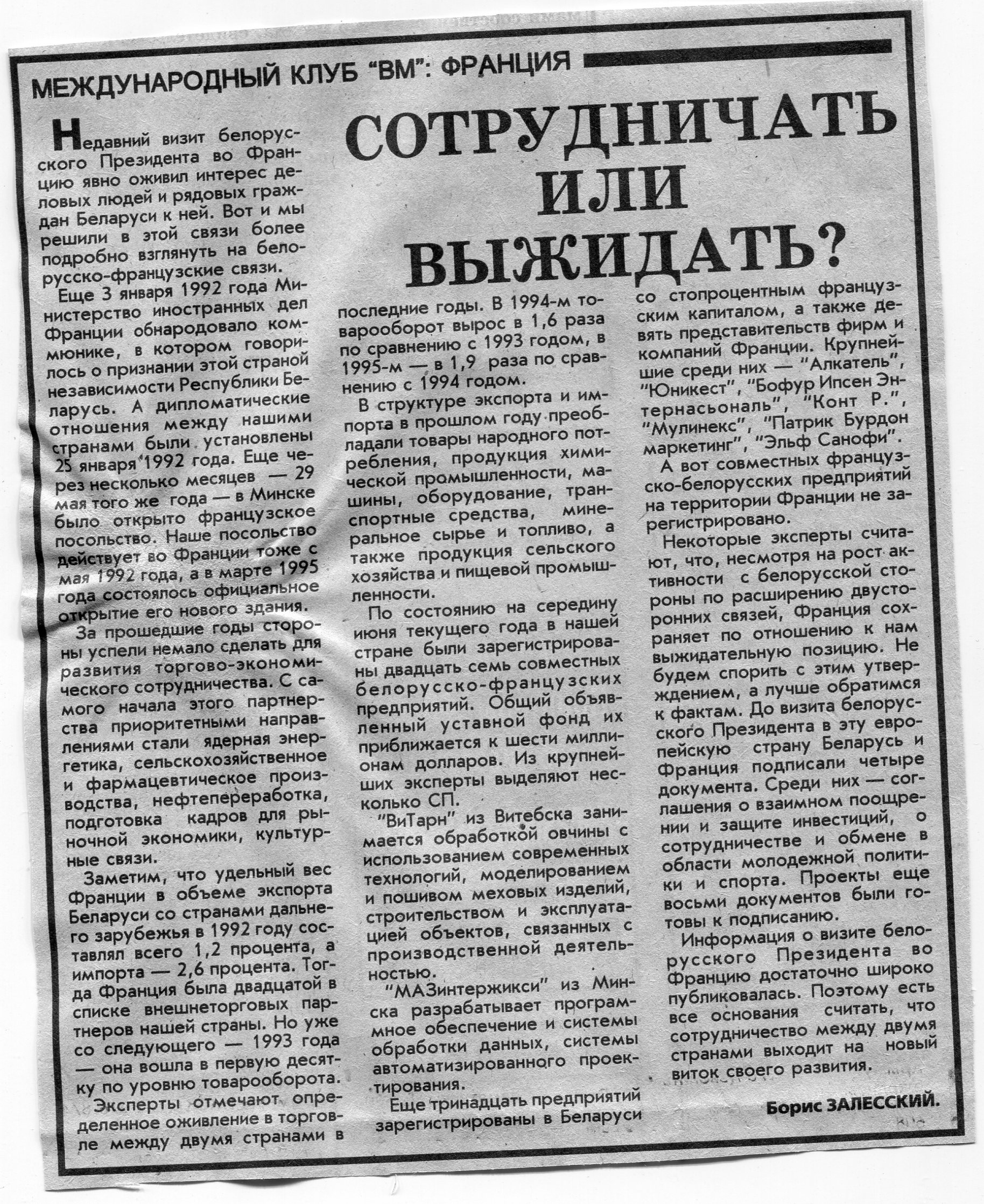 Залесский, Б. Сотрудничать или выжидать? / Б. Залесский // Вечерний Минск. - 1996. - 1 авг.