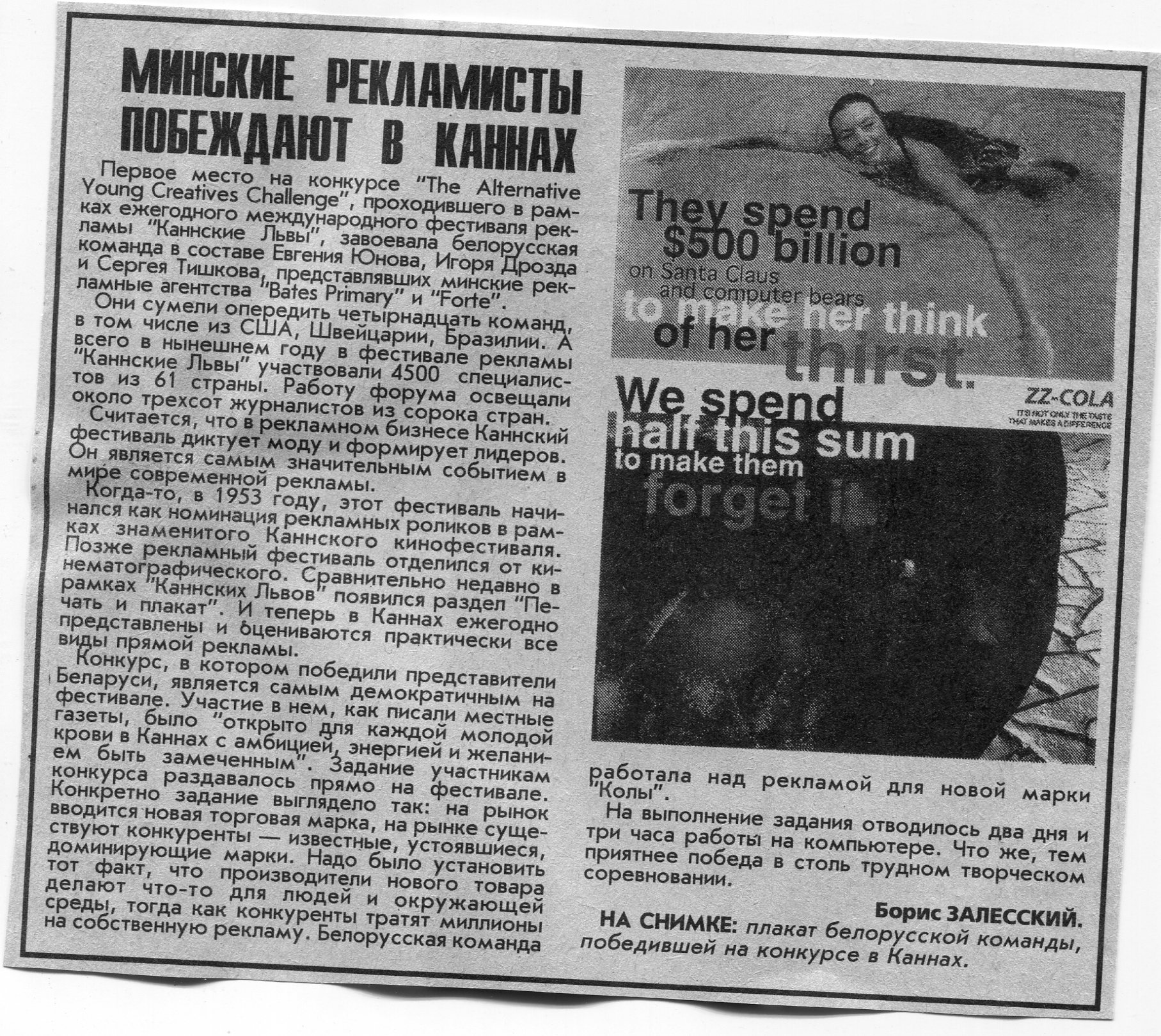 Залесский, Б. Минские рекламисты побеждают в Каннах / Б. Залесский // Вечерний Минск. - 1997. - 15 июл.