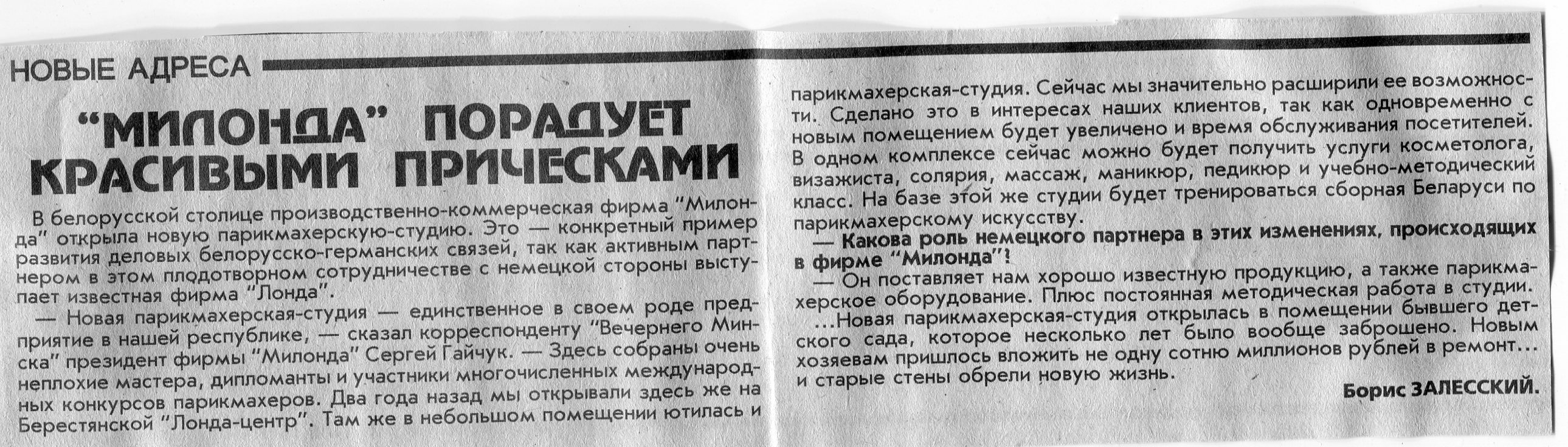 Залесский, Б. "Милонда" порадует красивыми прическами / Б. Залесский // Вечерний Минск. - 1996. - 27 дек.