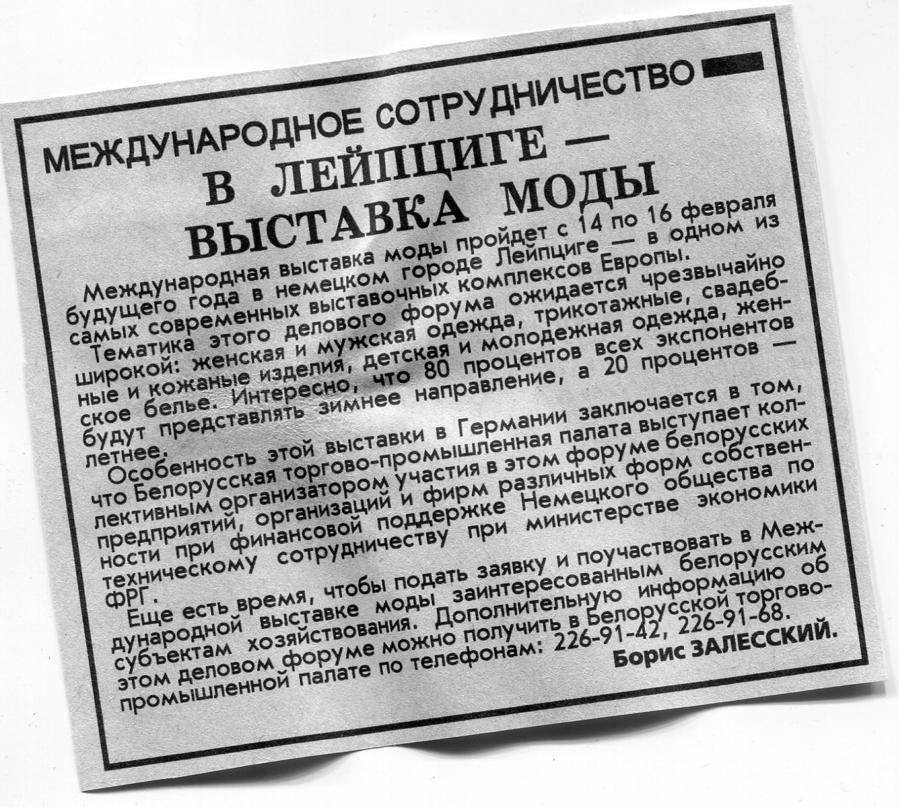 Залесский, Б. В Лейпциге - выставка моды / Б. Залесский // Вечерний Минск. - 1997. - 14 нояб.