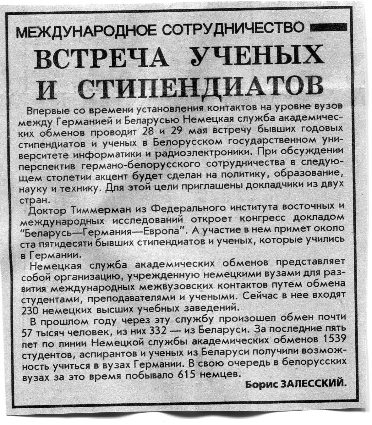 Залесский, Б. Встреча ученых и стипендиатов / Б. Залесский // Вечерний Минск. - 1998. - 27 мая.