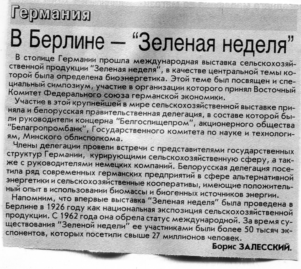 Залесский, Б. В Берлине - "Зеленая неделя" / Б. Залесский // Вечерний Минск. - 2007. - 25 янв.