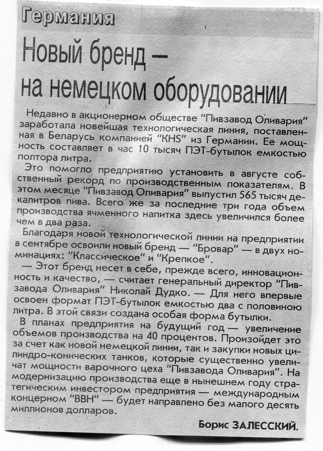 Залесский, Б. Новый бренд - на немецком оборудовании / Б. Залесский // Вечерний Минск. - 2007. - 28 сент.