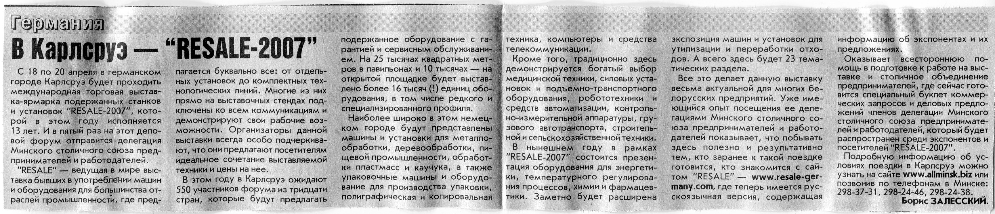 Залесский, Б. В Карлсруэ - "Resale-2007" / Б. Залесский // Вечерний Минск. - 2007. - 16 февр.