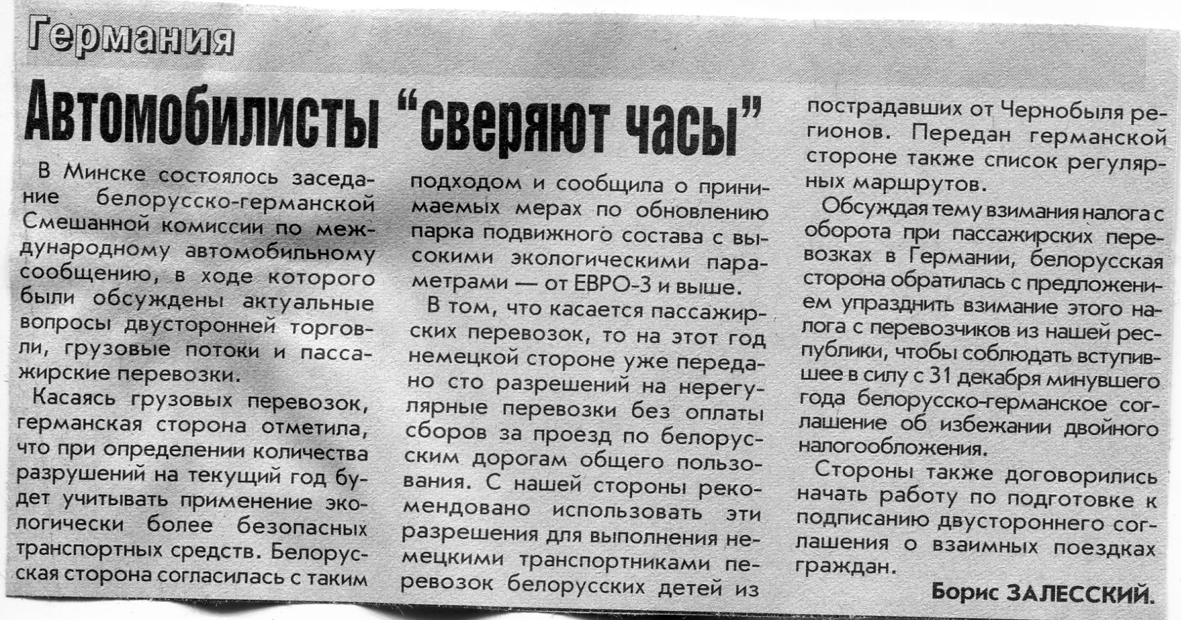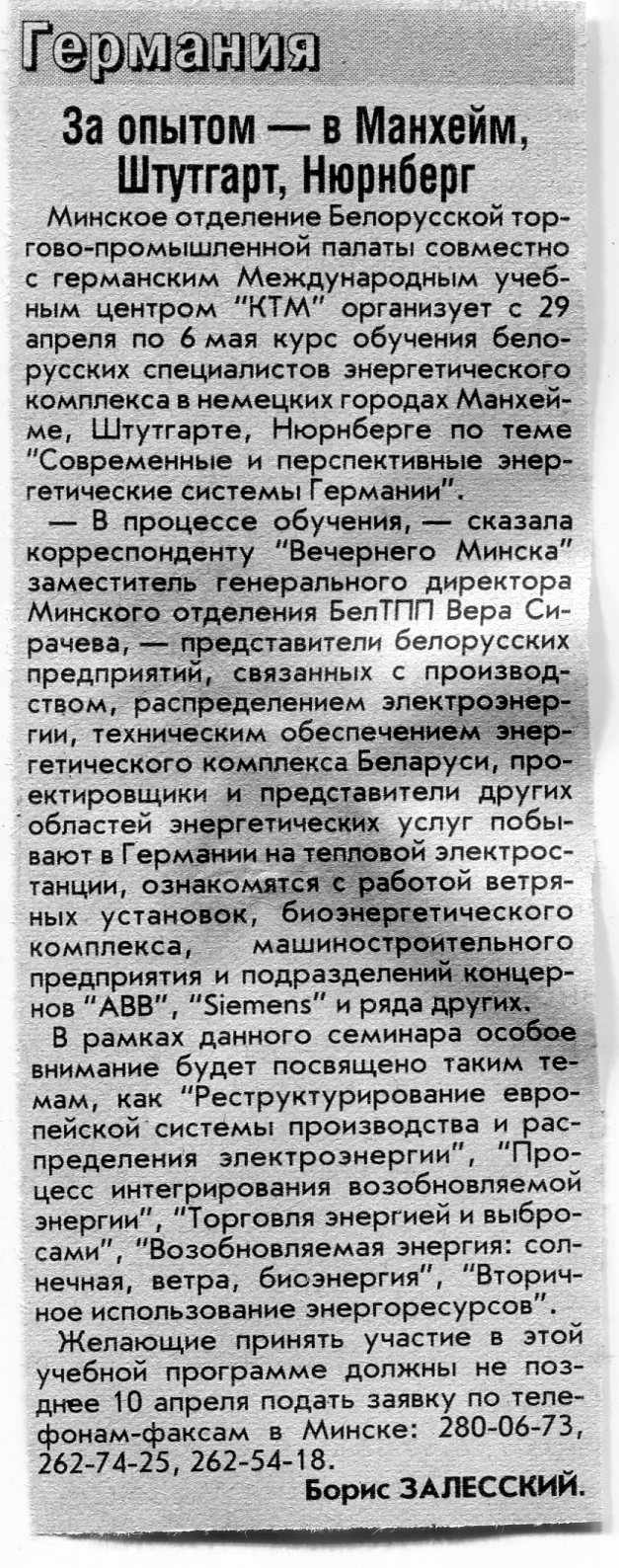 Залесский, Б. За опытом - в Манхейм, Штутгарт, Нюрнберг / Б. Залесский // Вечерний Минск. - 2007. - 11 апр.