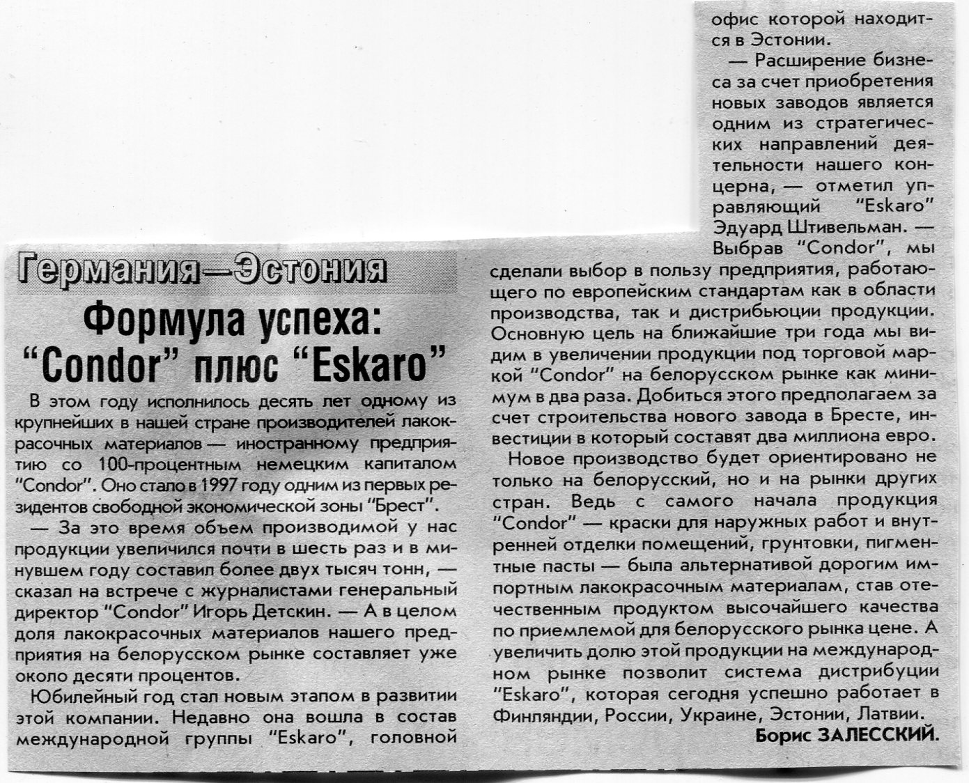 Залесский, Б. Формула успеха: "Condor" плюс "Eskaro" / Б. Залесский // Вечерний Минск. - 2007. - 23 июл.