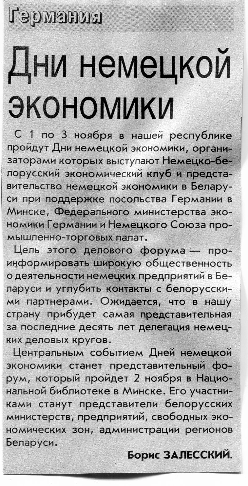 Залесский, Б. Дни немецкой экономики / Б. Залесский // Вечерний Минск. - 2007. - 31 окт.