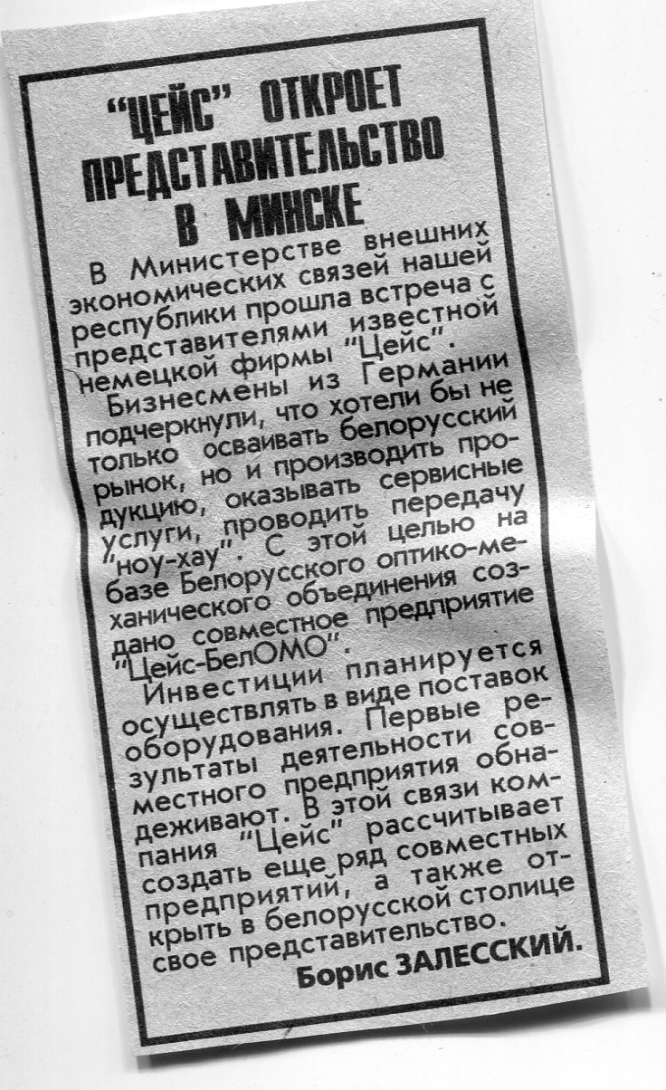 Залесский, Б. "Цейс" откроет представительство в Минске / Б. Залесский // Вечерний Минск. - 1996. - 29 июл.