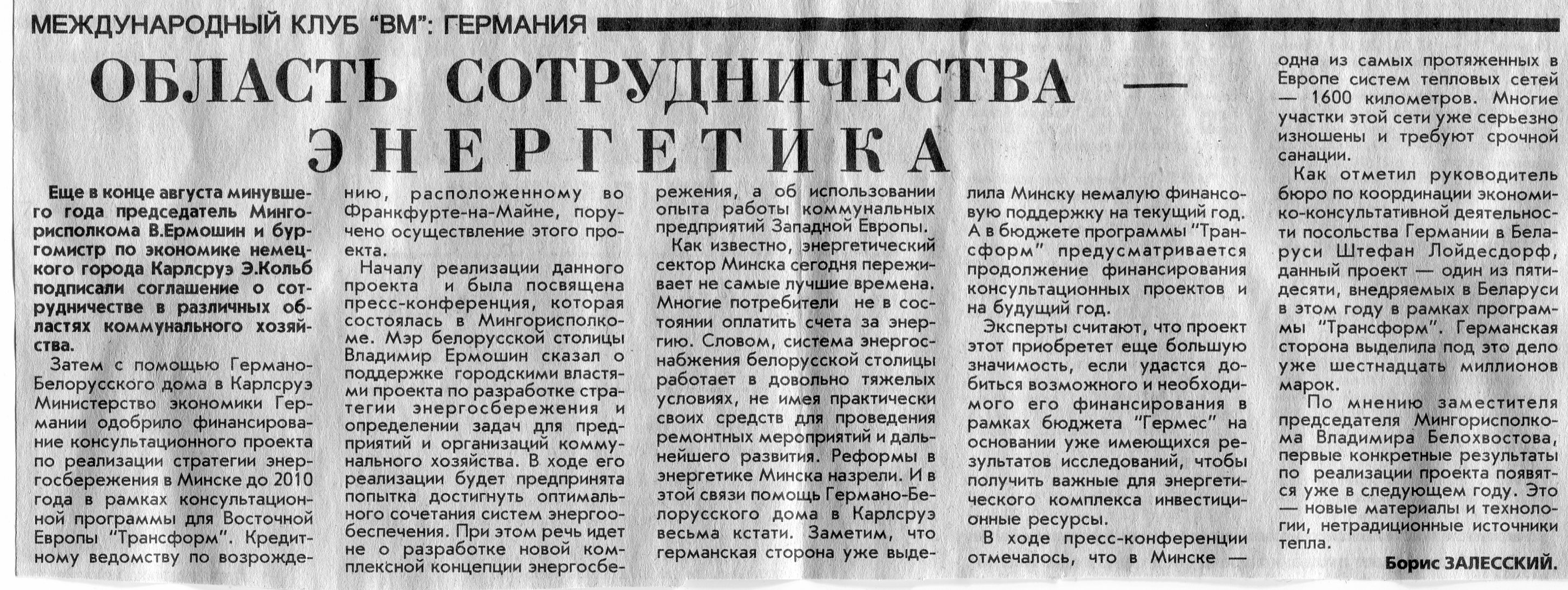 Залесский, Б. Область сотрудничества - энергетика / Б. Залесский // Вечерний Минск. - 1996. - 17 июл.