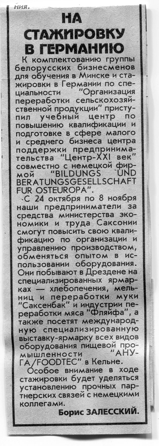 Залесский, Б. На стажировку в Германию / Б. Залесский // Вечерний Минск. - 1996. - 28 авг.