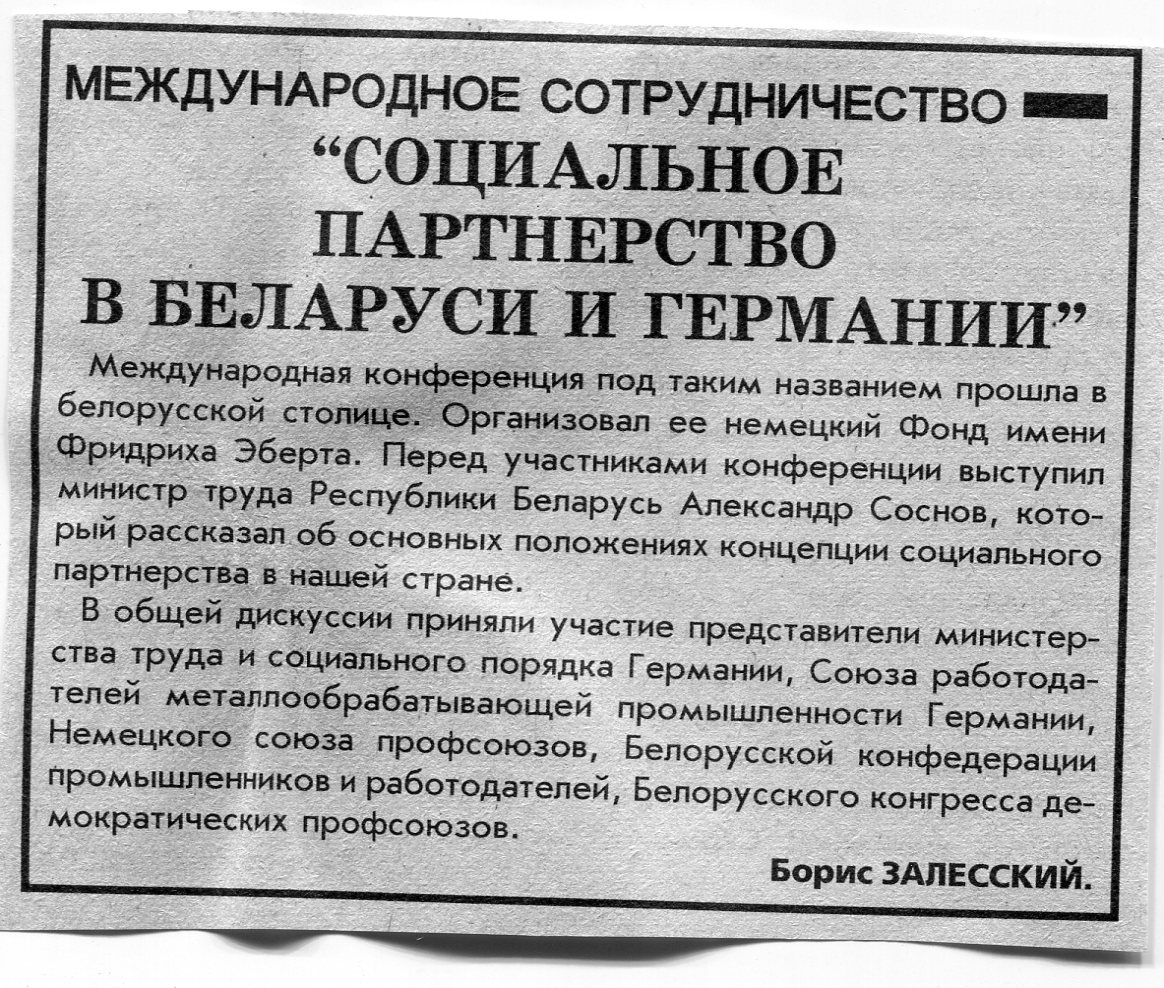 Залесский, Б. "Социальное партнерство в Беларуси и Германии" / Б. Залесский // Вечерний Минск. - 1996. - 13 нояб.