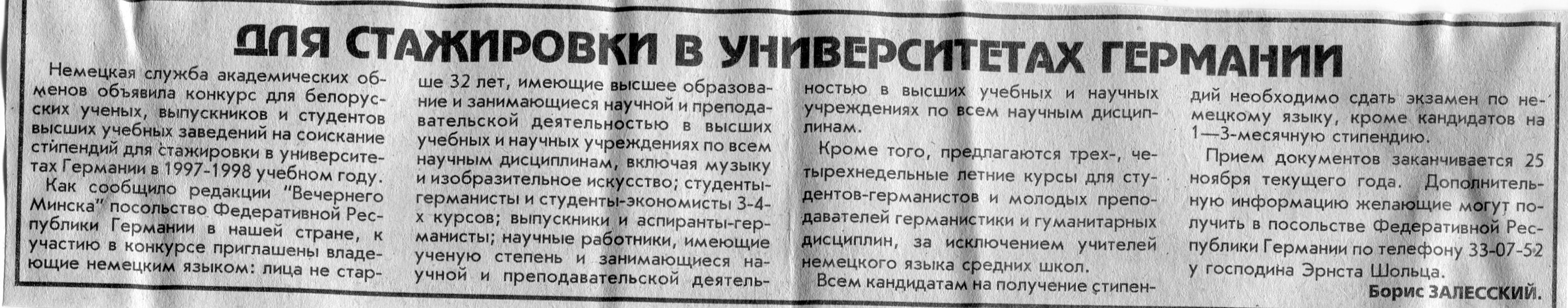 Залесский, Б. Для стажировки в университетах Германии / Б. Залесский // Вечерний Минск. - 1996. - 23 сент.