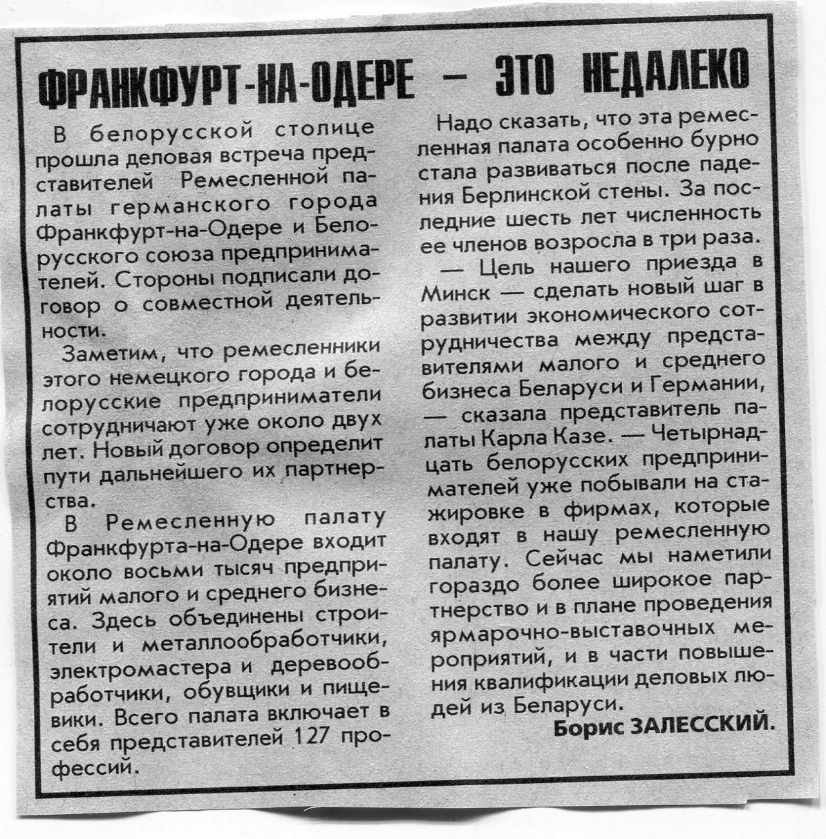 Залесский, Б. Франкфурт-на-Одере - это недалеко / Б. Залесский // Вечерний Минск. - 1996. - 16 сент.