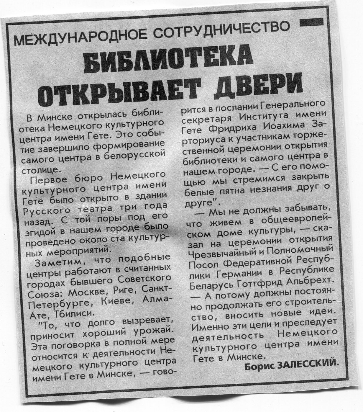Залесский, Б. Библиотека открывает двери / Б. Залесский // Вечерний Минск. - 1996. - 4 нояб.