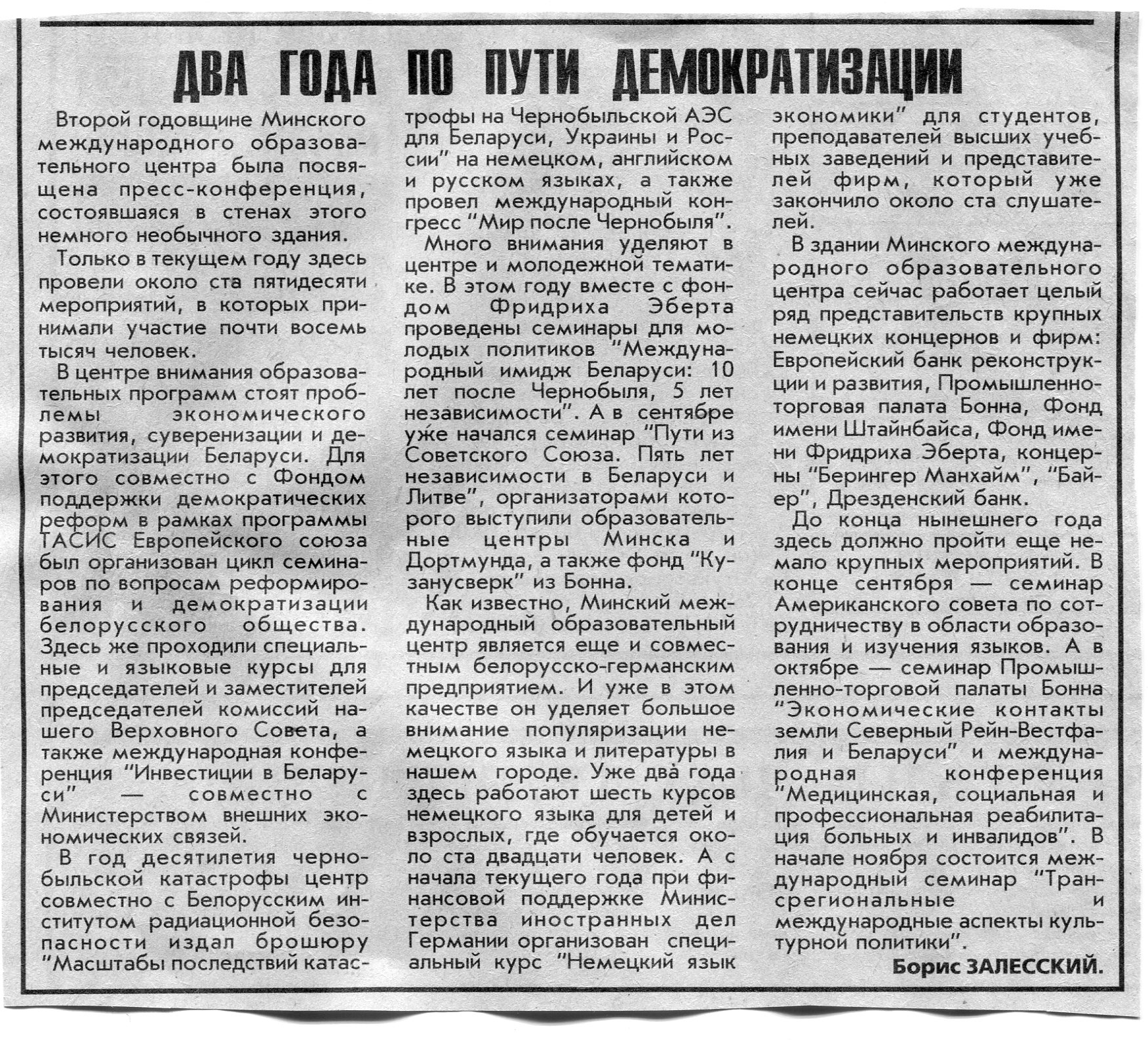 Залесский, Б. Два года по пути демократизации / Б. Залесский // Вечерний Минск. - 1996. - 16 сент.