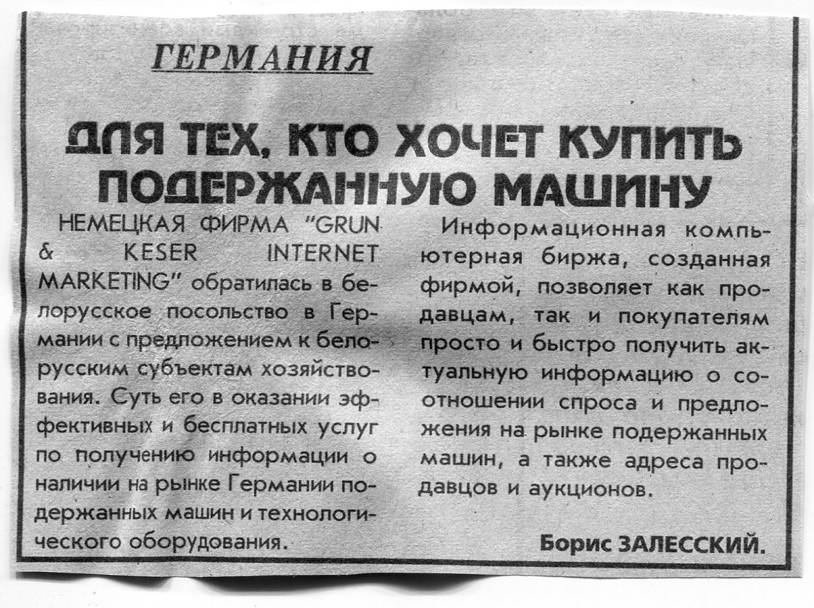 Залесский, Б. Ищут партнеров в Беларуси / Б. Залесский // Вечерний Минск. - 1996. - 20 нояб.
