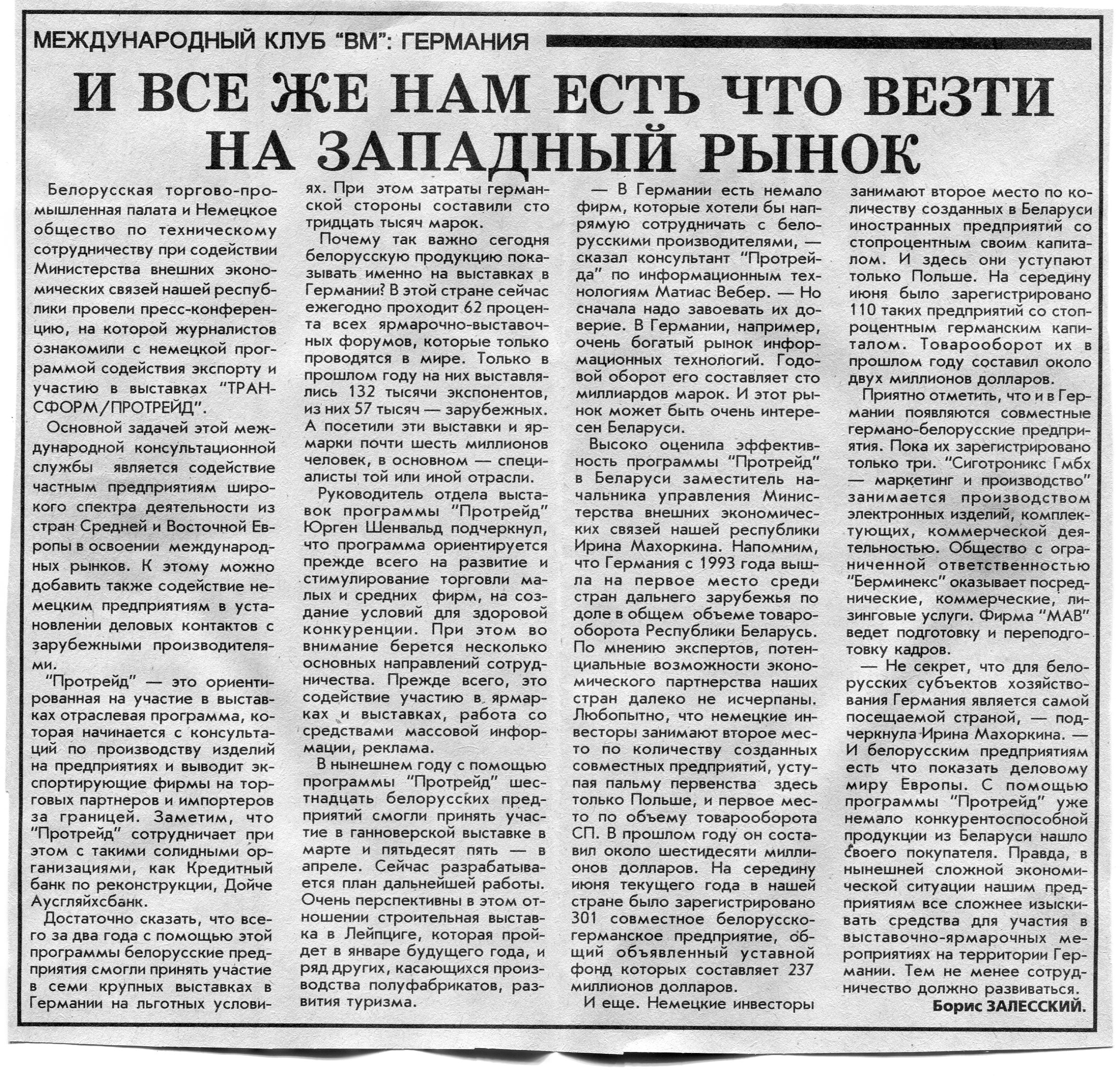 Залесский, Б. И все же нам есть что везти на западный рынок / Б. Залесский // Вечерний Минск. - 1996. - 10 июл.