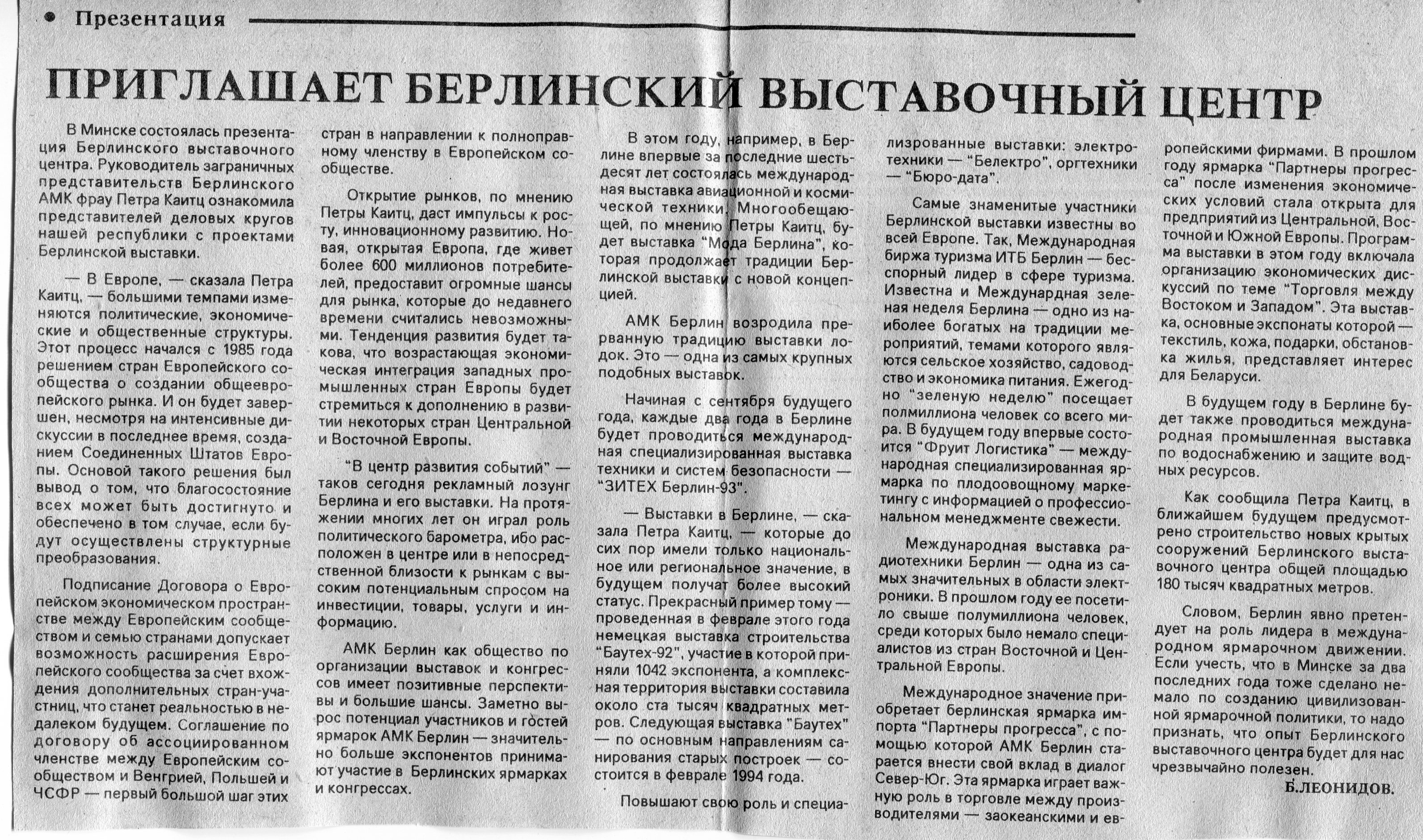 Леонидов, Б. Приглашает Берлинский выставочный центр / Б. Залесский // Деловая орбита. - 1992. - №23. - С. 2.