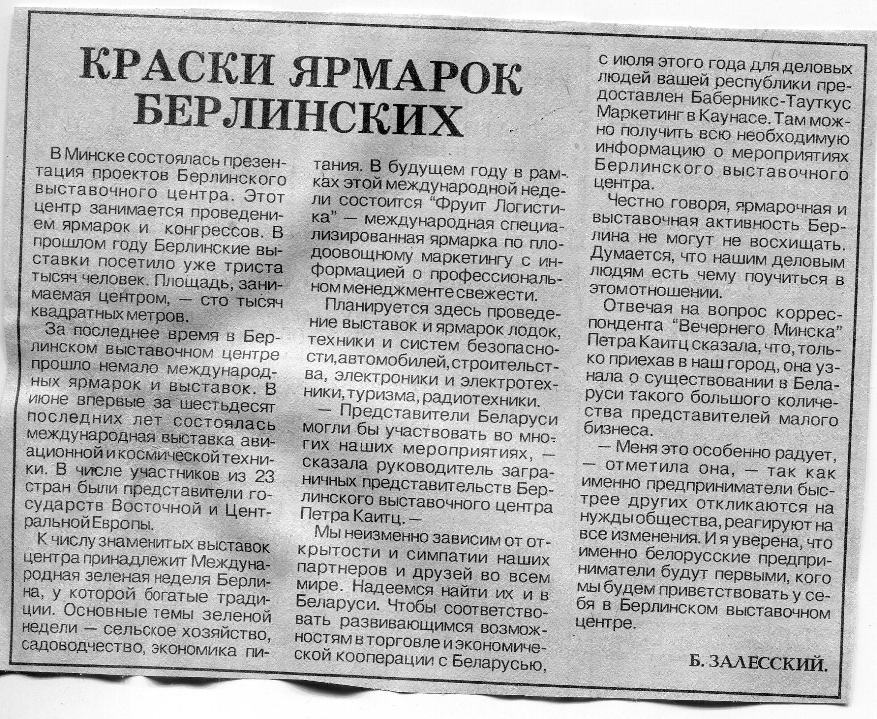 Залесский, Б. Краски ярмарок берлинских / Б. Залесский // Вечерний Минск. - 1992. - 2 дек.