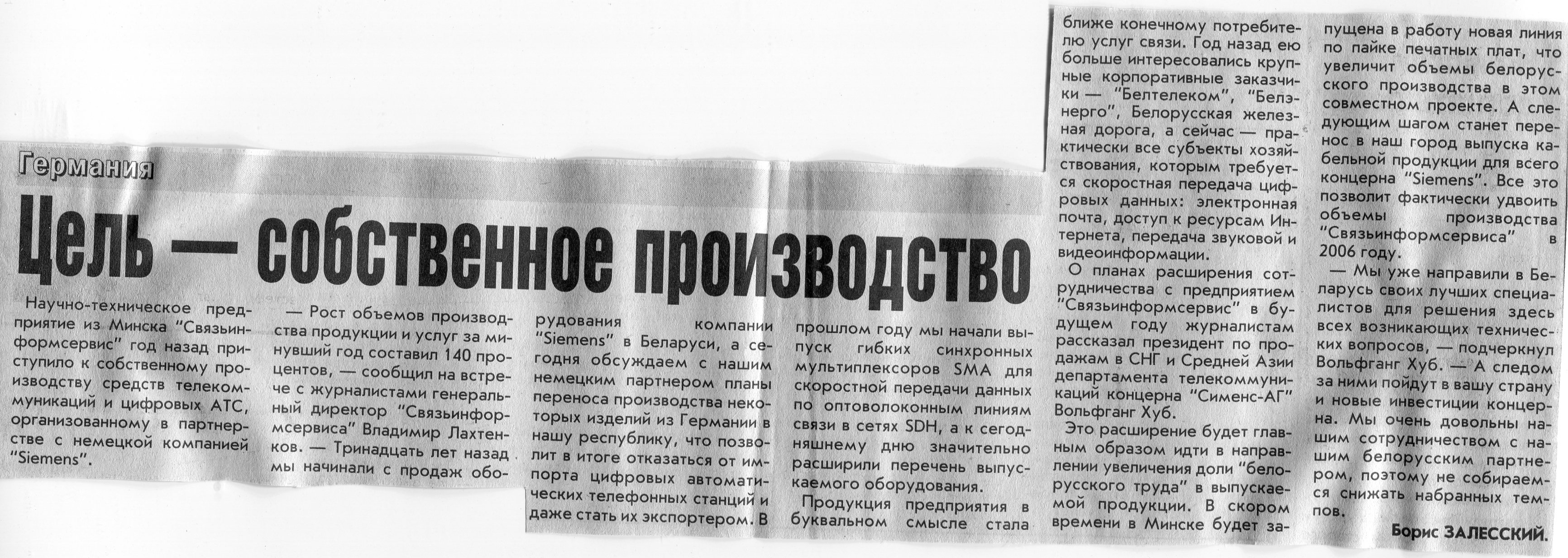 Залесский, Б. Цель - собственное производство / Б. Залесский // Вечерний Минск. - 2005. - 2 дек.