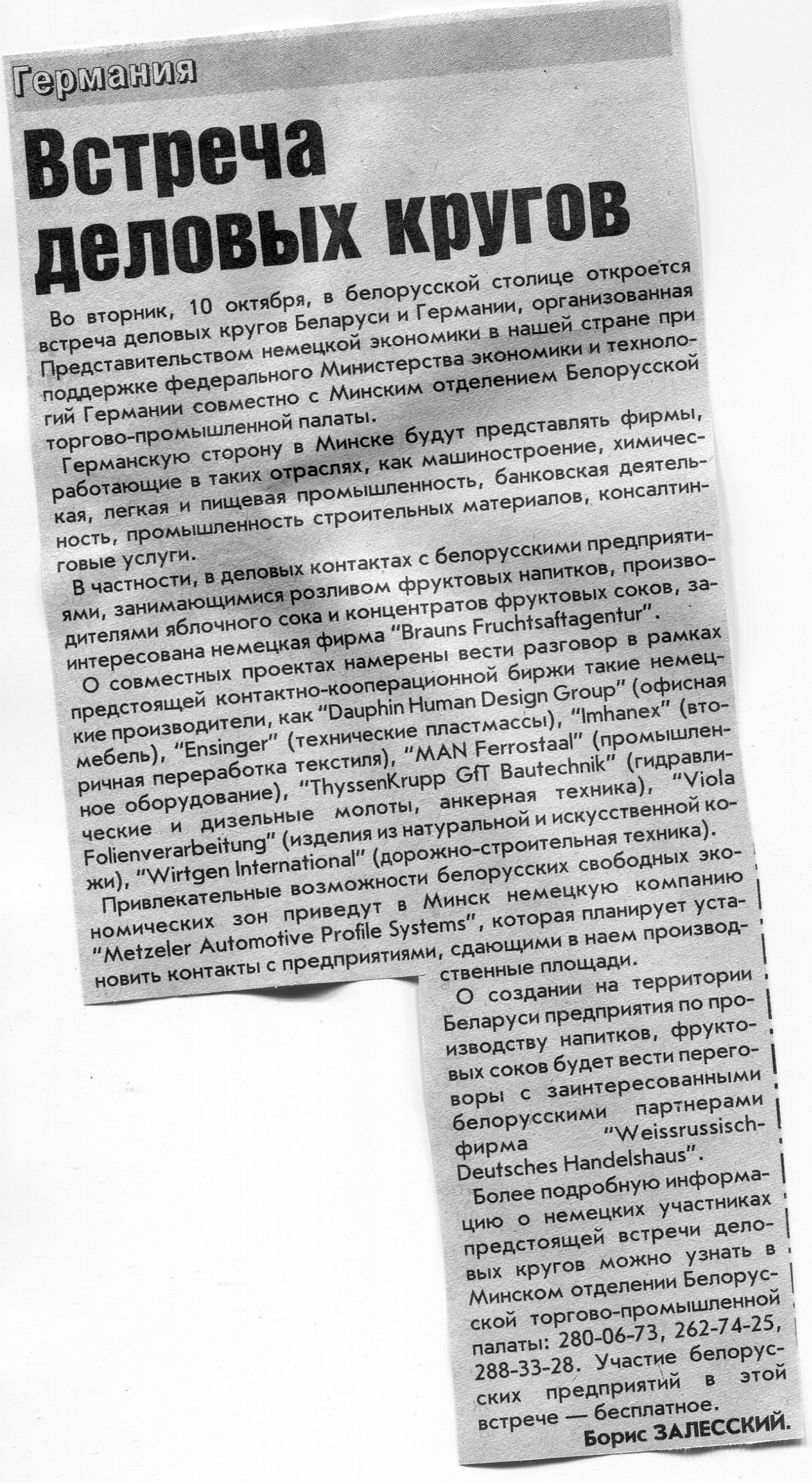 Залесский, Б. Встреча деловых кругов / Б. Залесский // Вечерний Минск. - 2005. - 10 окт.