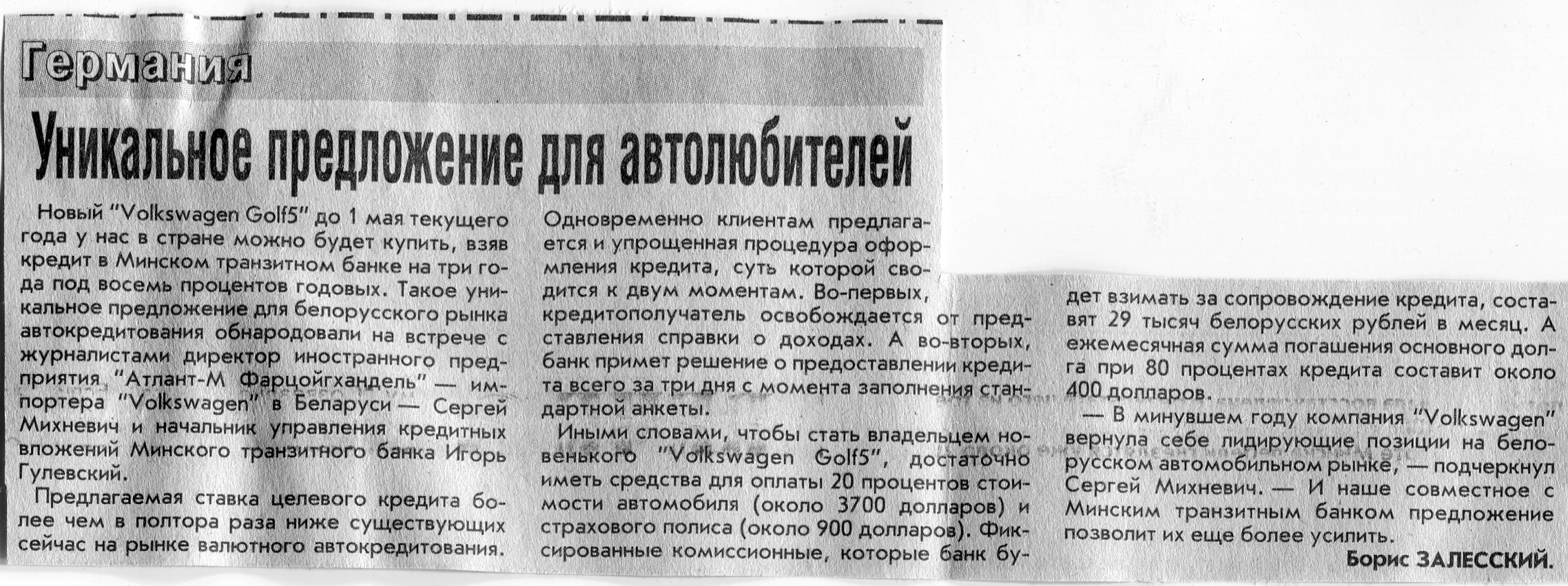Залесский, Б. Уникальное предложение для автолюбителей / Б. Залесский // Вечерний Минск. - 2006. - 8 февр.