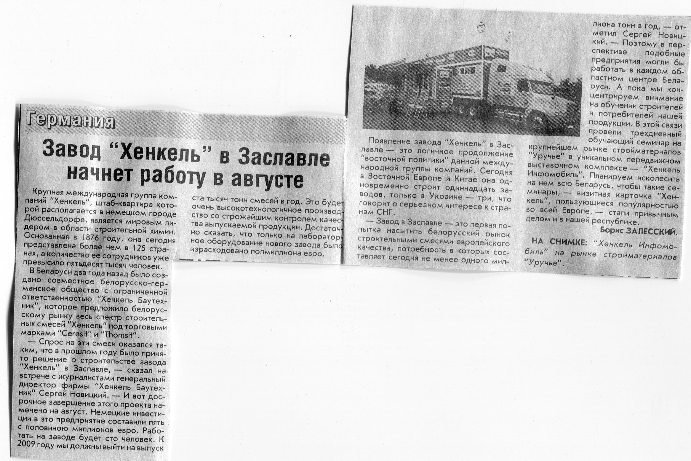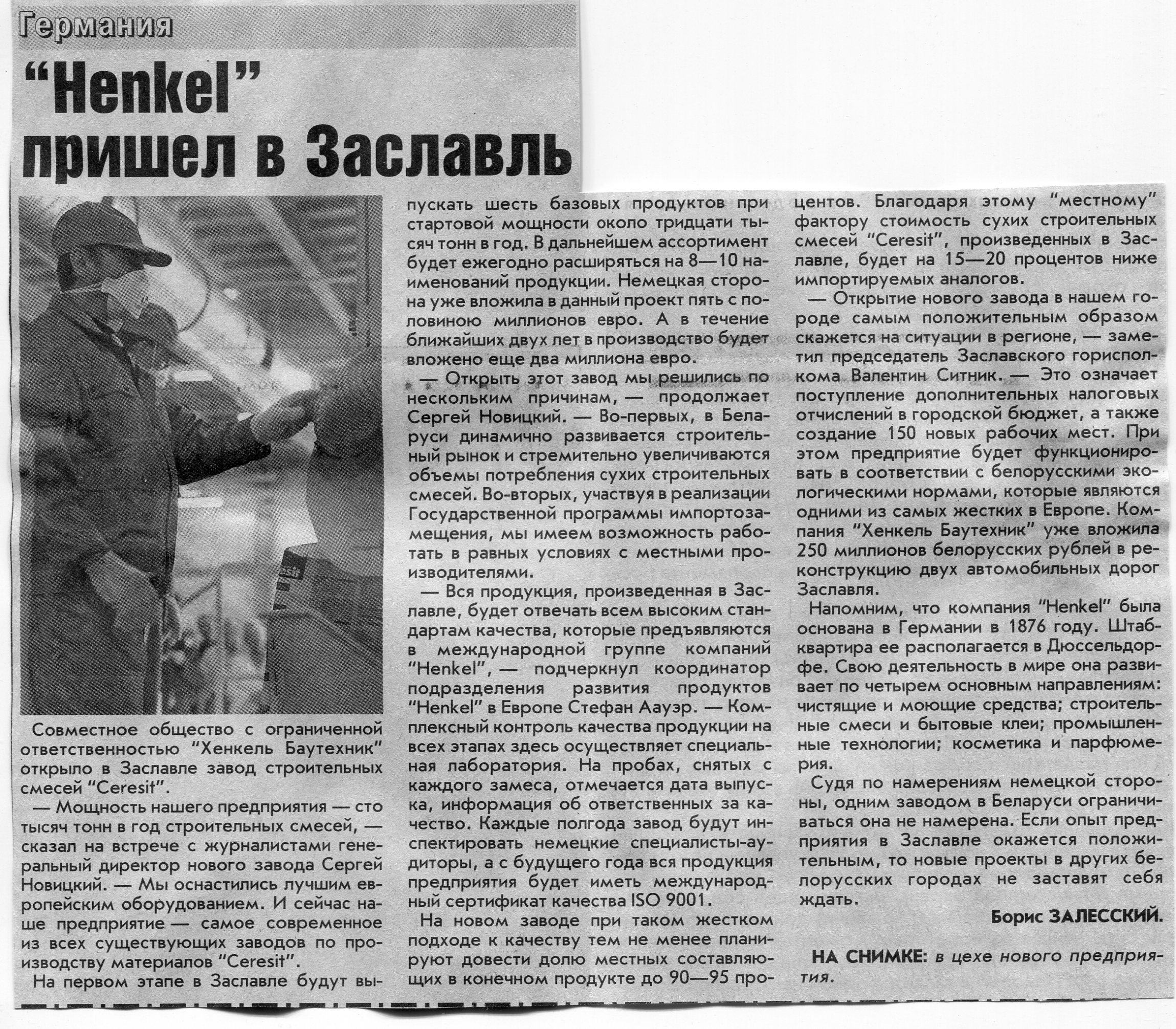 Залесский, Б. "Henkel" пришел в Заславль / Б. Залесский // Вечерний Минск. - 2006. - 20 сент.