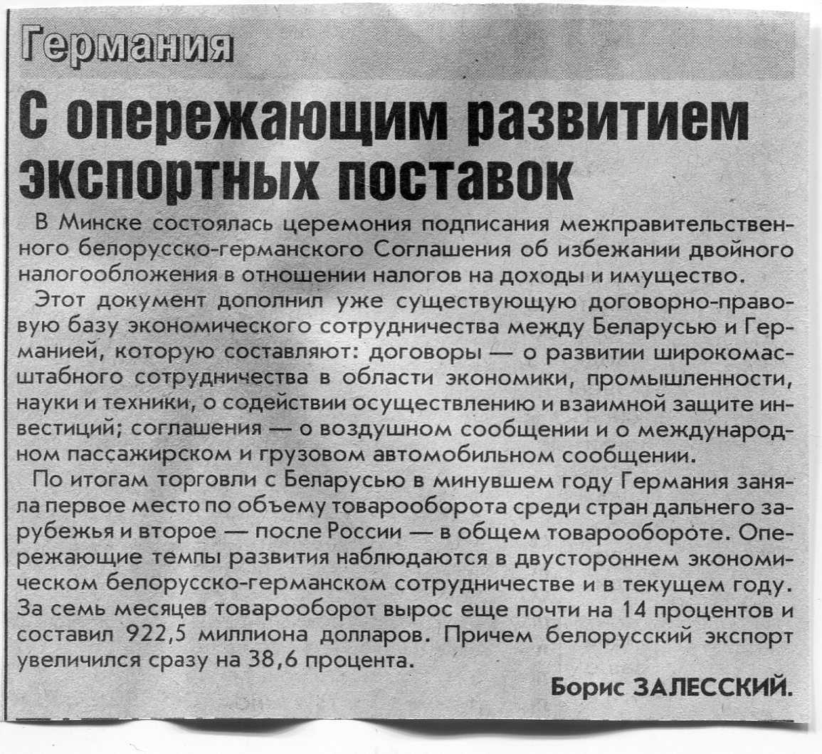 Залесский, Б. Бизнес Европы – рынку Беларуси / Б. Залесский // Народная газета. – 2006. – 8 апр.