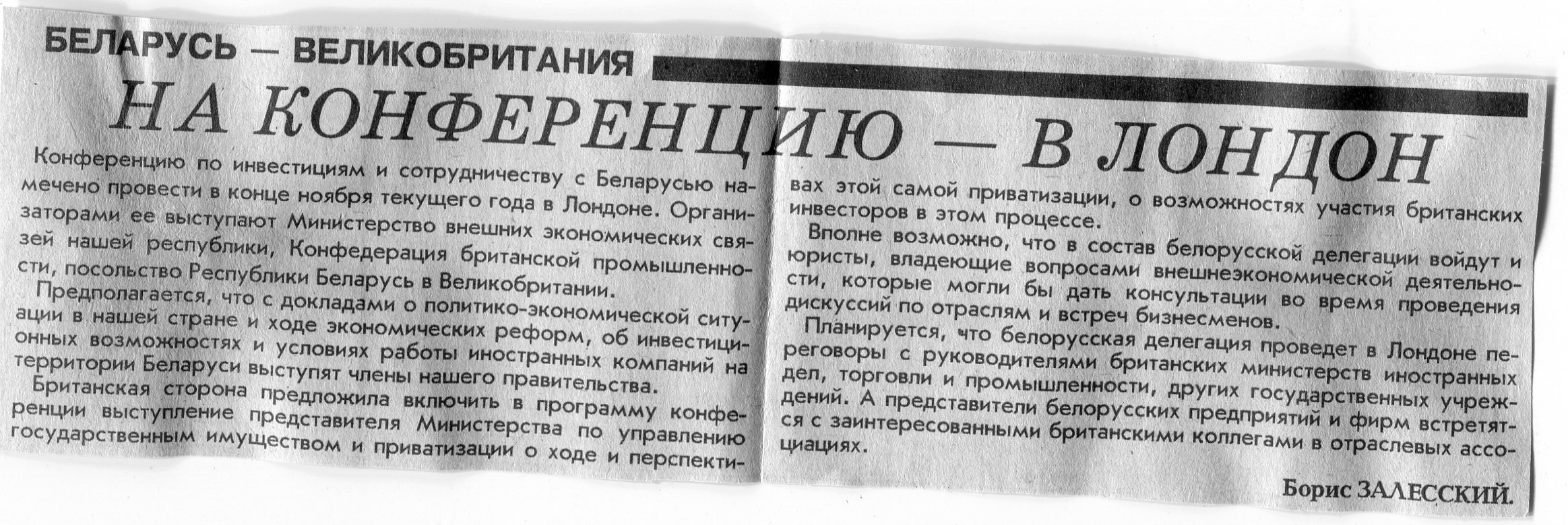 Залесский, Б. На конференцию - в Лондон / Б. Залесский // Вечерний Минск. - 1995. - 6 сент.