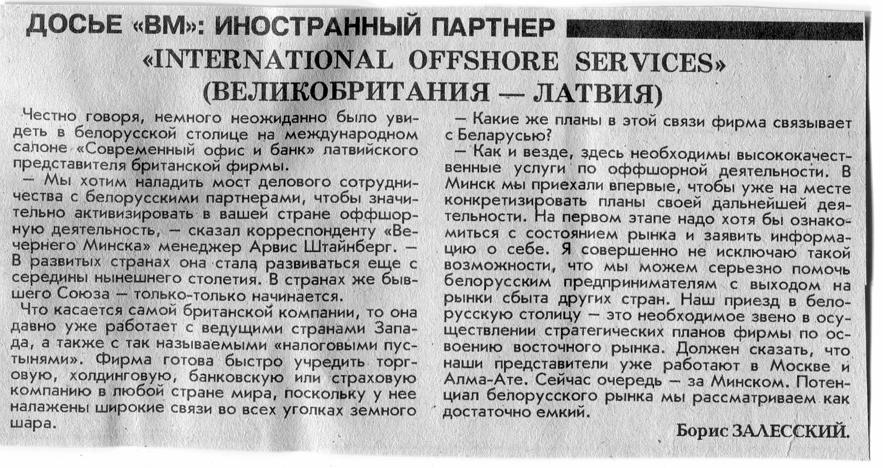 Залесский, Б. "International offshore services" (Великобритания - Латвия) / Б. Залесский // Вечерний Минск. - 1995. - 18 сент.