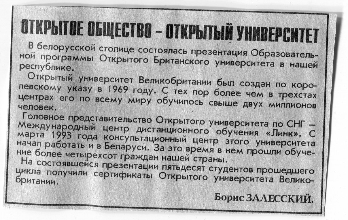 Залесский, Б. Открытое общество - открытый университет / Б. Залесский // Вечерний Минск. - 1995. - 9 нояб.