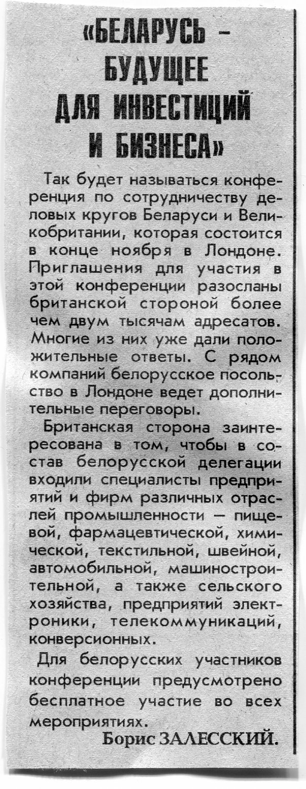 Залесский, Б. "Беларусь - будущее для инвестиций и бизнеса" / Б. Залесский // Вечерний Минск. - 1995. - 8 нояб.