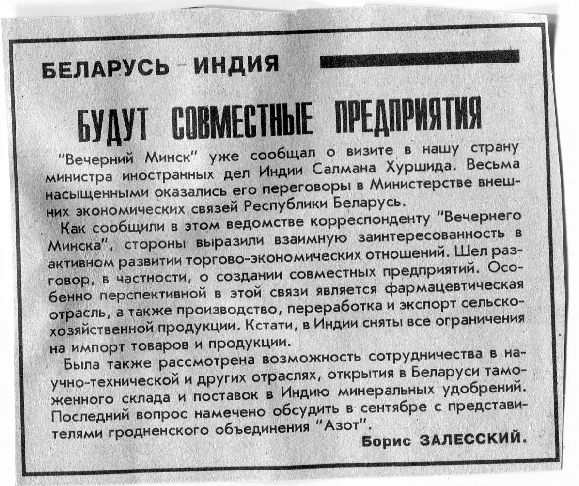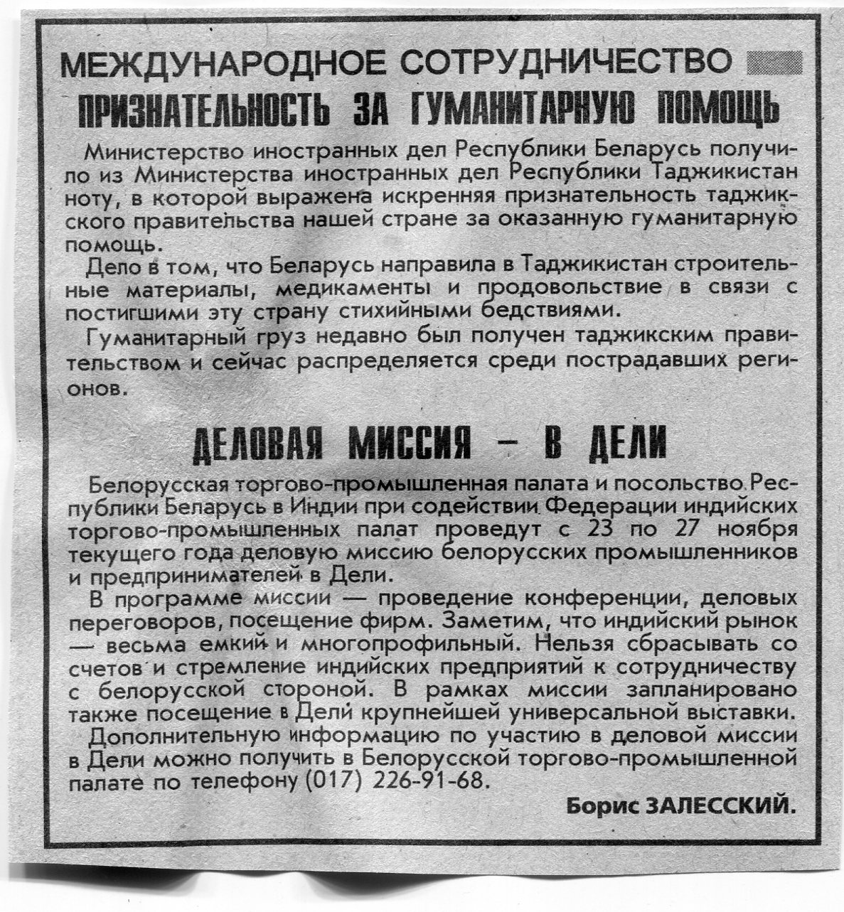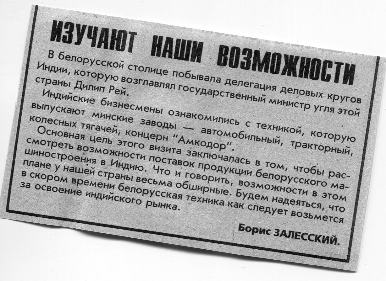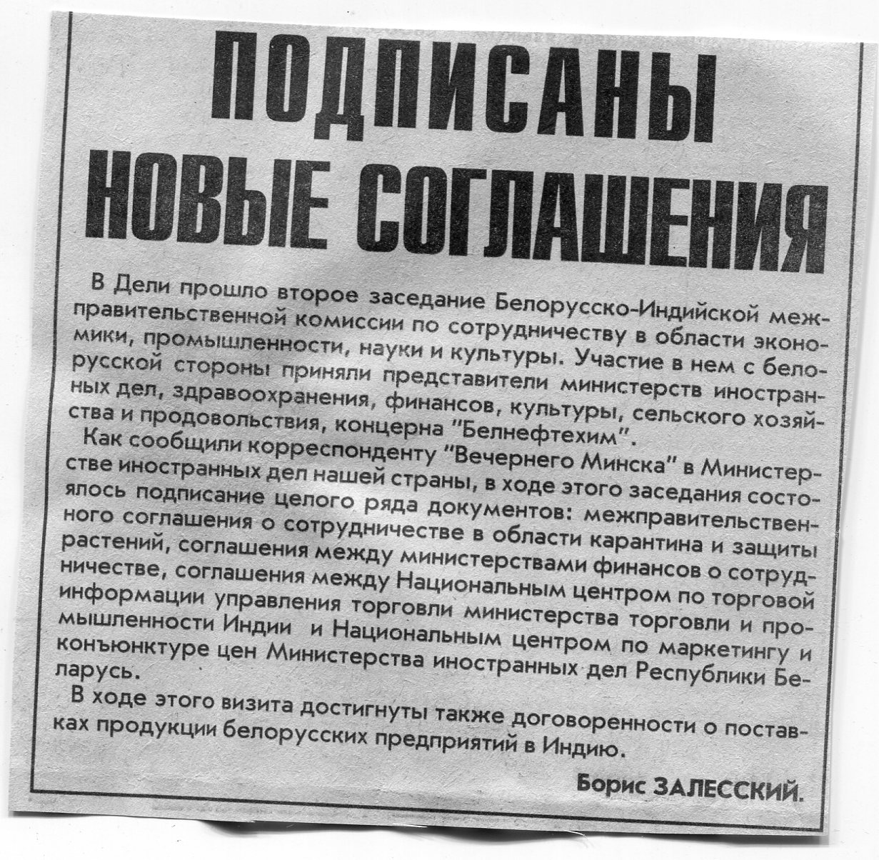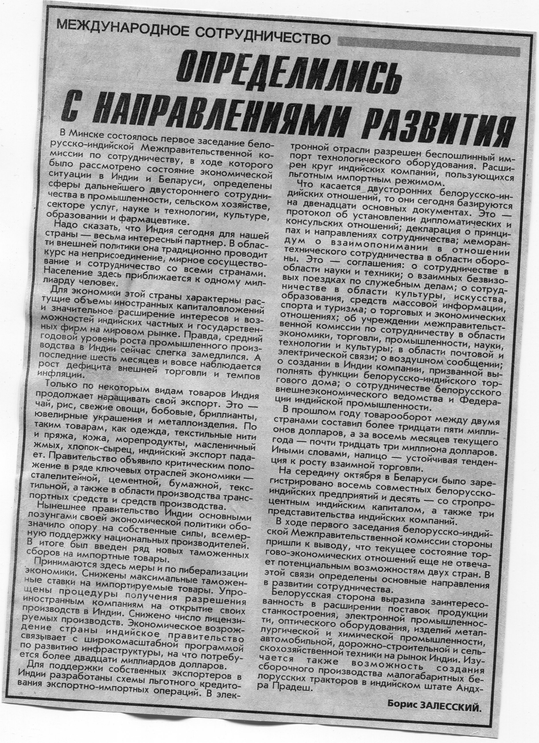Залесский, Б. Деловая миссия - в Дели / Б. Залесский // Вечерний Минск. - 1998. - 23 сент.