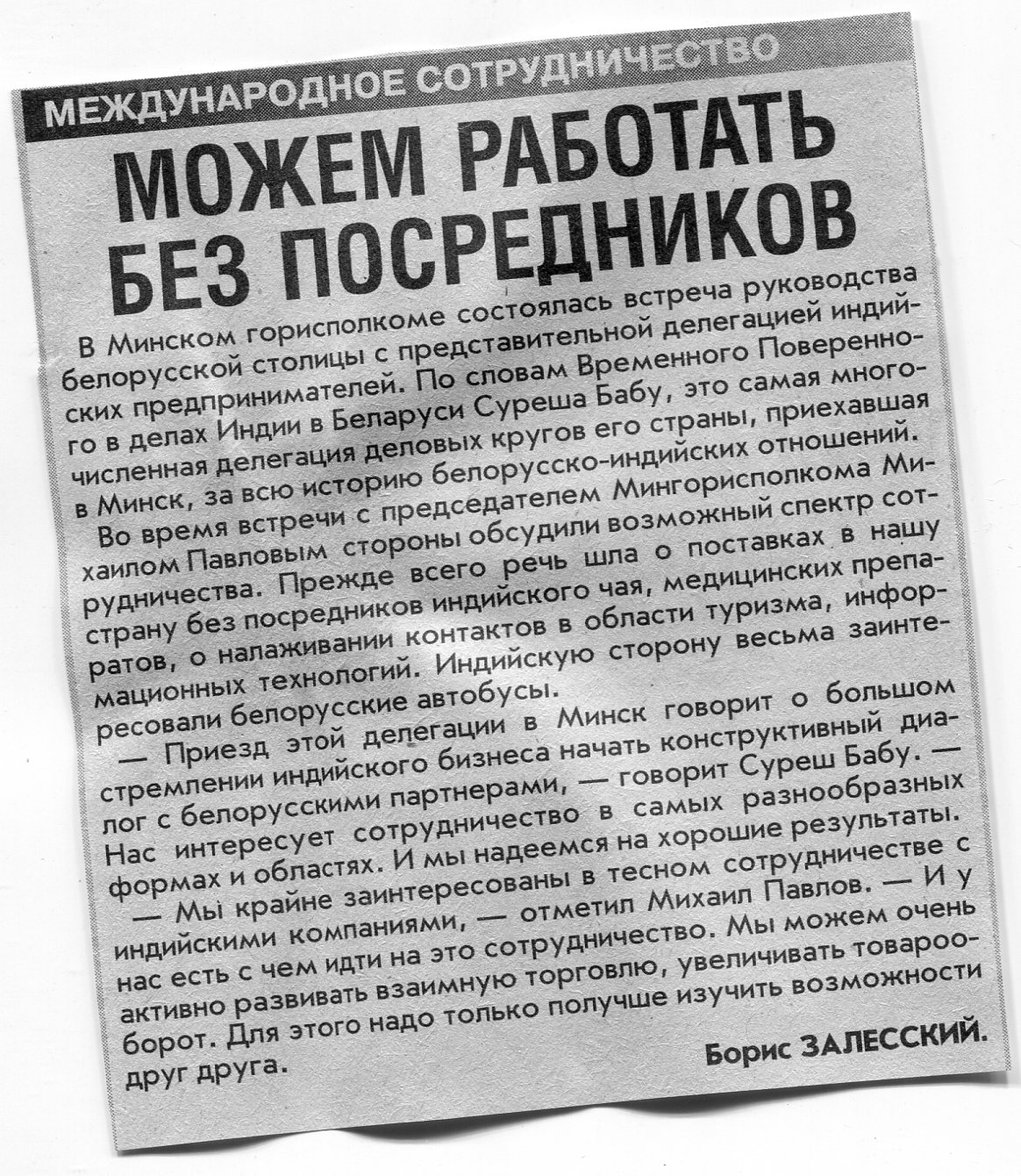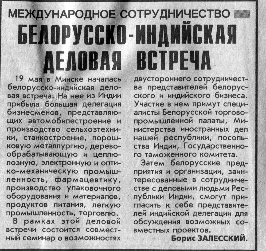 Залесский, Б. Белорусско-индийская деловая встреча / Б. Залесский // Вечерний Минск. - 1999. - 19 мая.