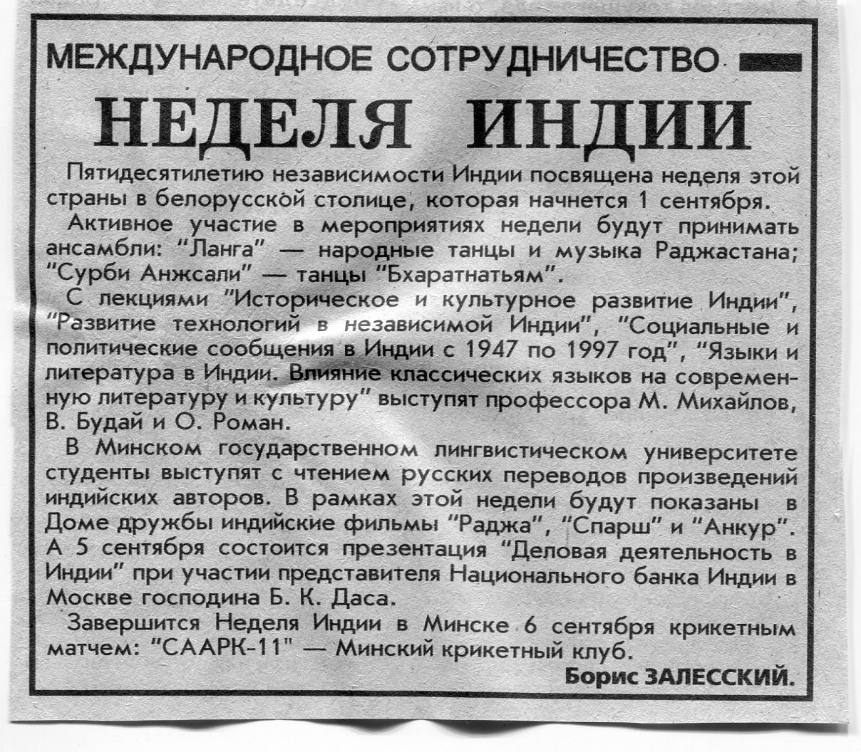 Залесский, Б. Неделя Индии / Б. Залесский // Вечерний Минск. - 1997. - 28 авг.