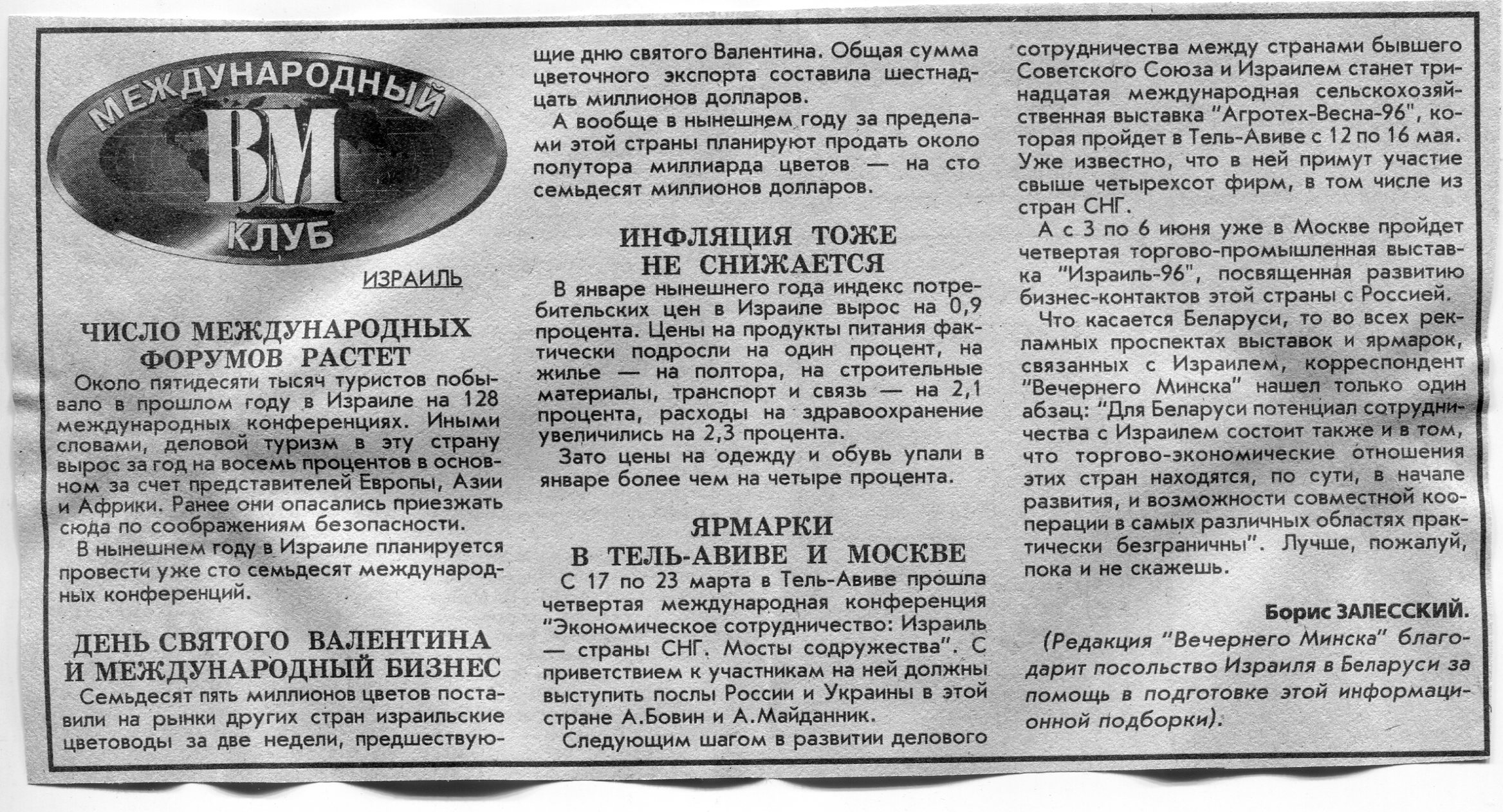 Залесский, Б. Ярмарки в Тель-Авиве и Москве / Б. Залесский // Вечерний Минск. - 1996. - 28 мар.