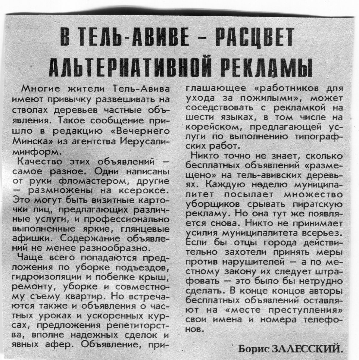 Залесский, Б. В Тель-Авиве - расцвет альтернативной реклламы / Б. Залесский // Вечерний Минск. - 1995. - 6 дек.
