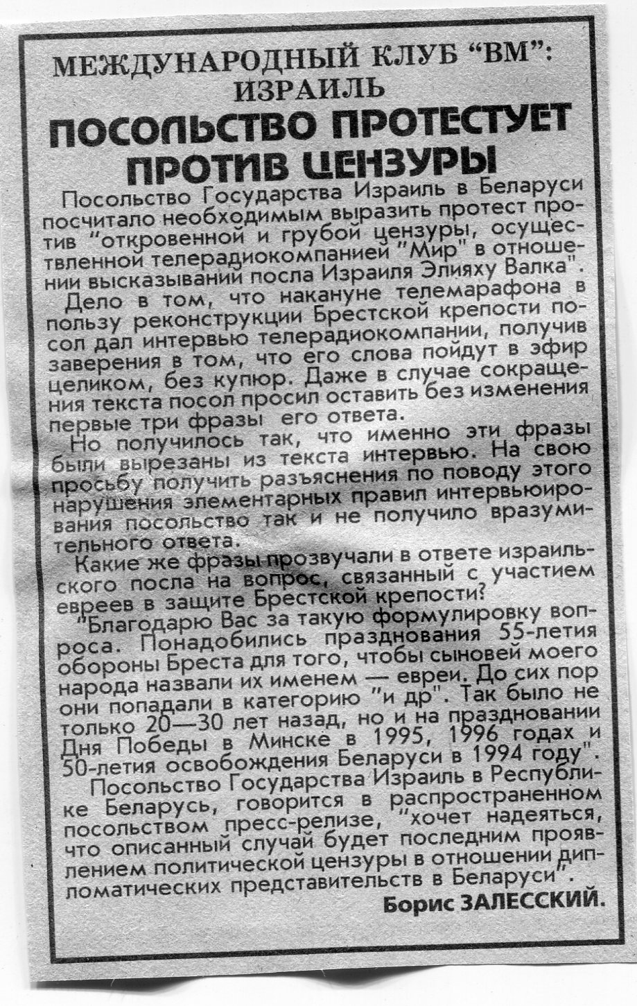 Залесский, Б. Посольство протестует против цензуры / Б. Залесский // Вечерний Минск. - 1996. - 18 июл.