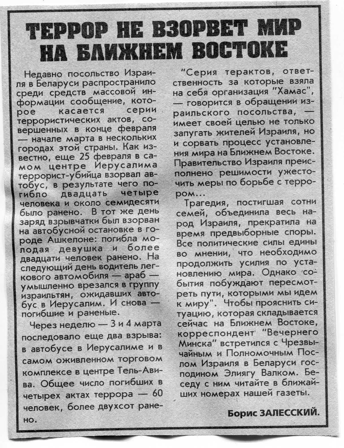 Залесский, Б. Элиягу Валк: "Трудно идти к миру через взрывы террористов" / Б. Залесский // Вечерний Минск. - 1996. - 13 мар.