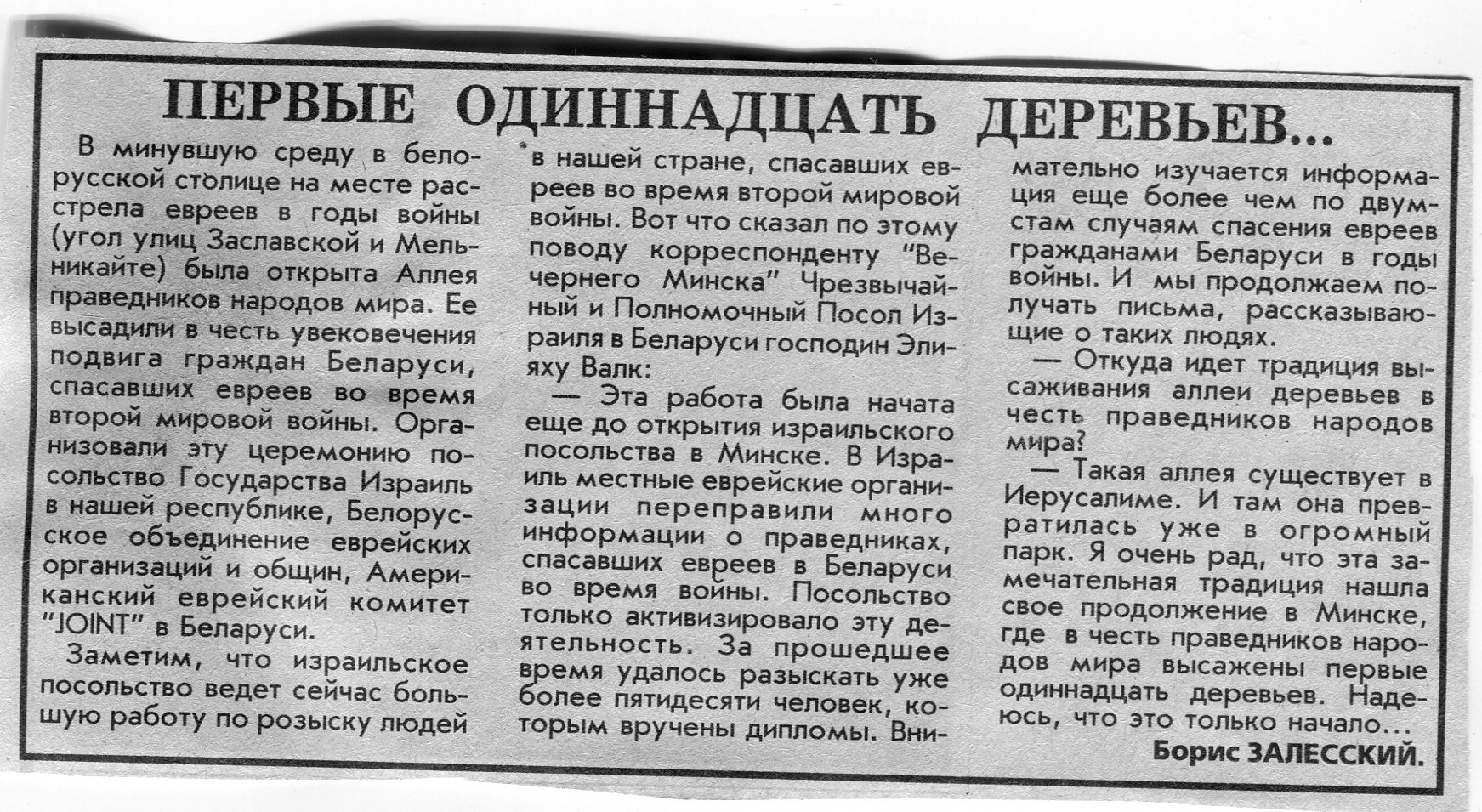 Залесский, Б. Первые одиннадцать деревьев... / Б. Залесский // Вечерний Минск. - 1996. - 8 июл.