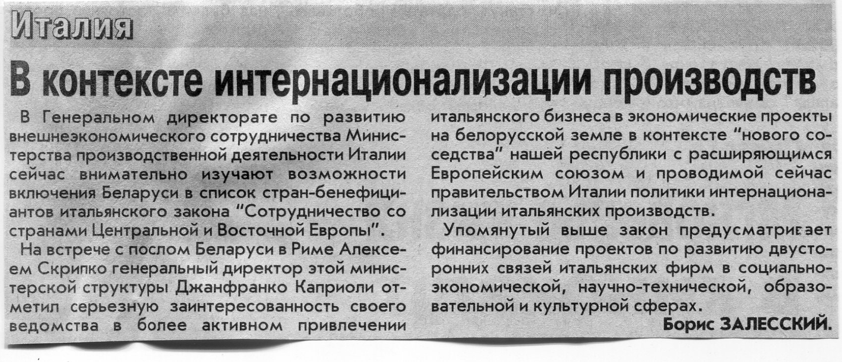 Залесский, Б. В контексте интернационализации производств / Б. Залесский // Вечерний Минск. - 2004. - 29 мар.