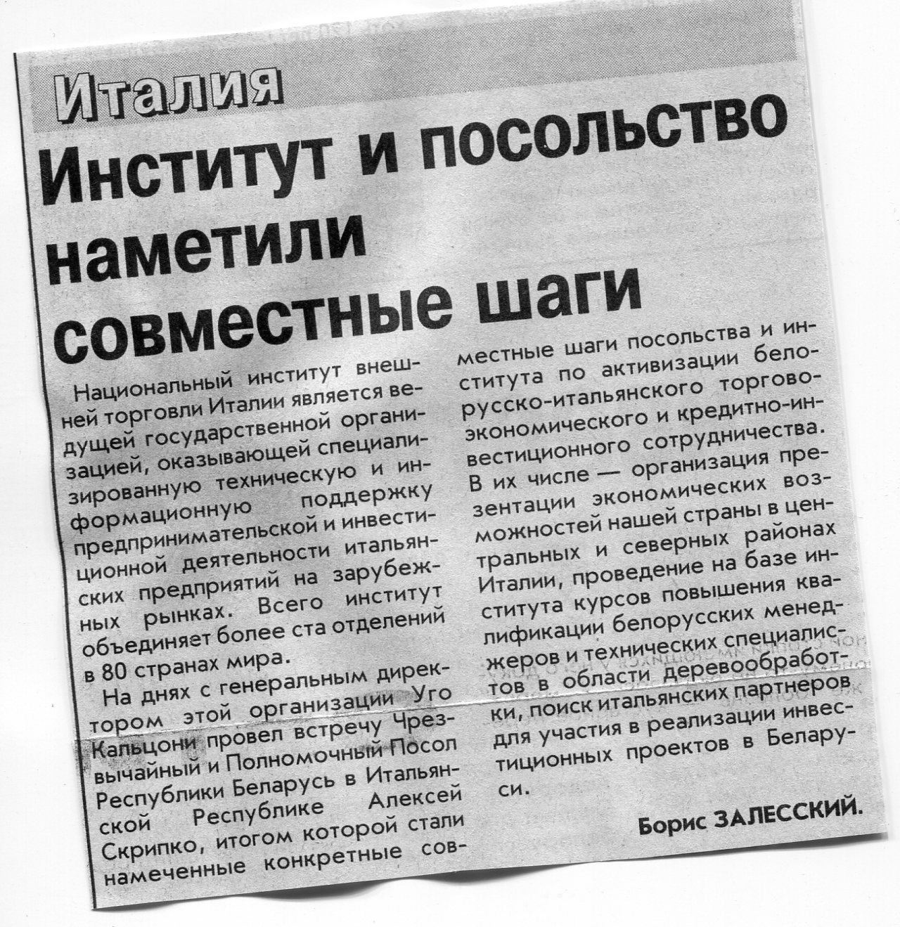 Залесский, Б. Институт и посольство наметили совместные шаги / Б. Залесский // Вечерний Минск. - 2003. - 14 апр.